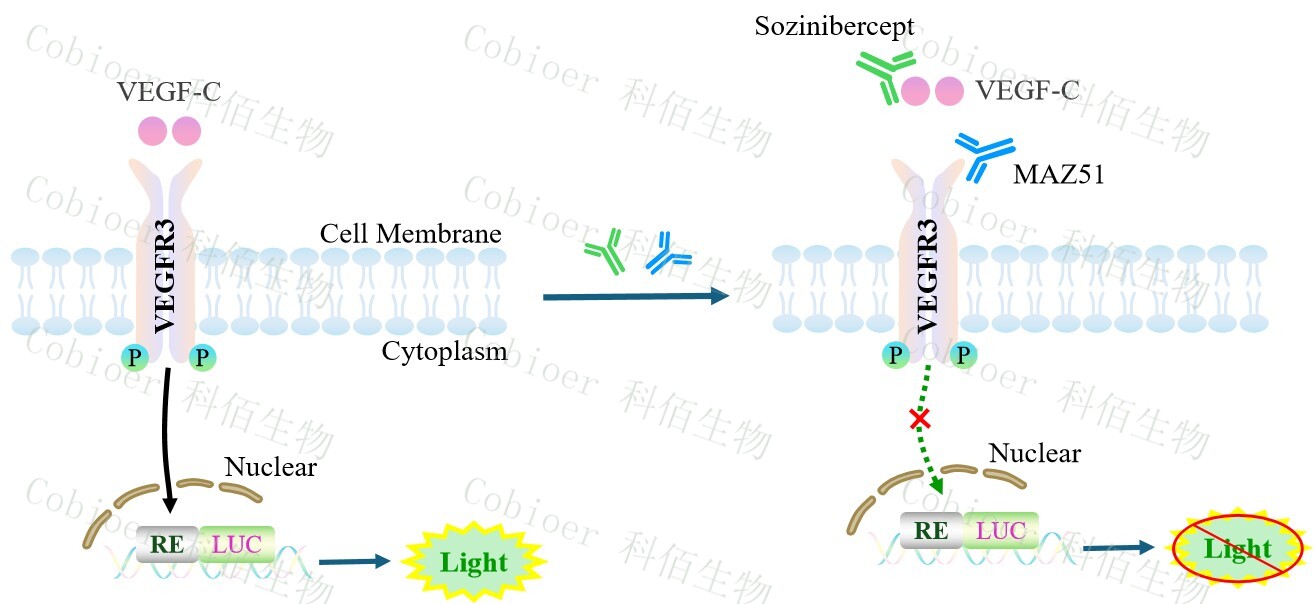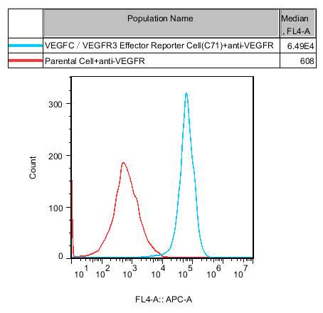 VEGFC/VEGFR3 Effector Reporter Cell 報告基因藥靶模型很好的模擬了體內 VEGFC/VEGFR3 的信號轉導過程,原理見下圖所示。![]() Figure 1. VEGFC/VEGFR3 Effector Reporter Cell 細胞模型原理圖 |