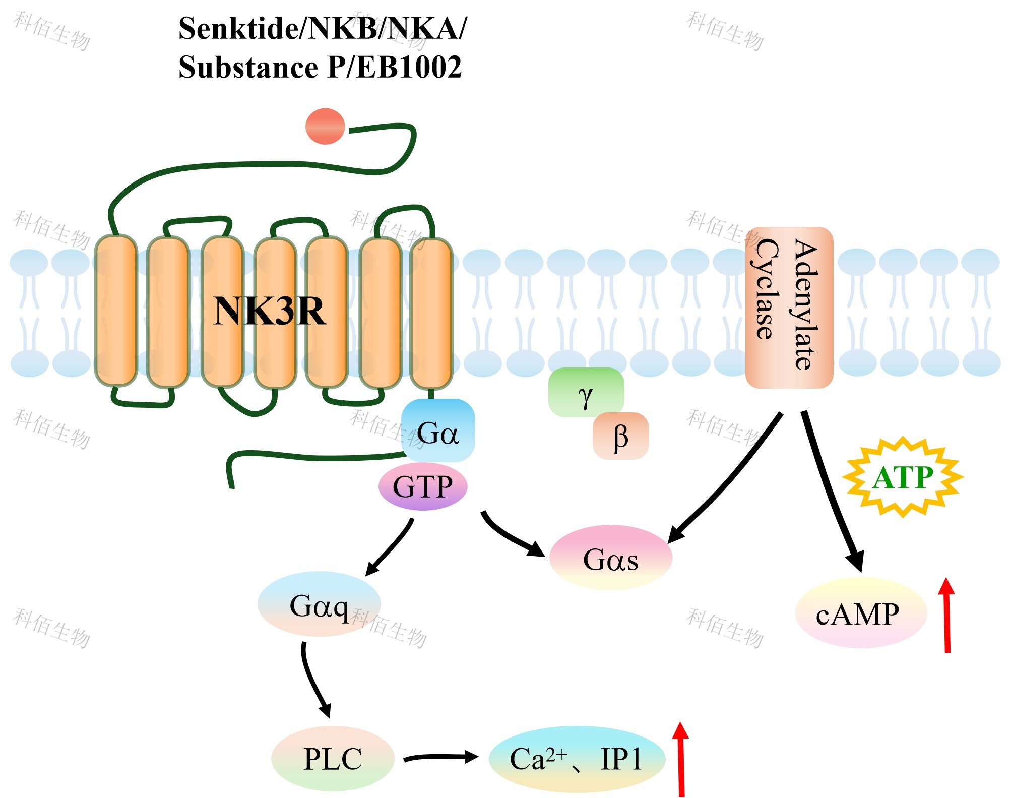 cAMP 在 G 蛋白偶聯(lián)受體(GPCR)信號轉(zhuǎn)導(dǎo)中是一種關(guān)鍵的第二信使。當(dāng)配體結(jié)合 到 GPCR,構(gòu)象發(fā)生變化,激活受體接著激活 G 蛋白,Gs 的激活導(dǎo)致腺苷酸環(huán)化酶調(diào)控 cAMP 的升高。NK3R HEK293 細胞藥靶模型很好的模擬了體內(nèi) NK3R 的信號轉(zhuǎn)導(dǎo)過程,原 理見下圖所示。