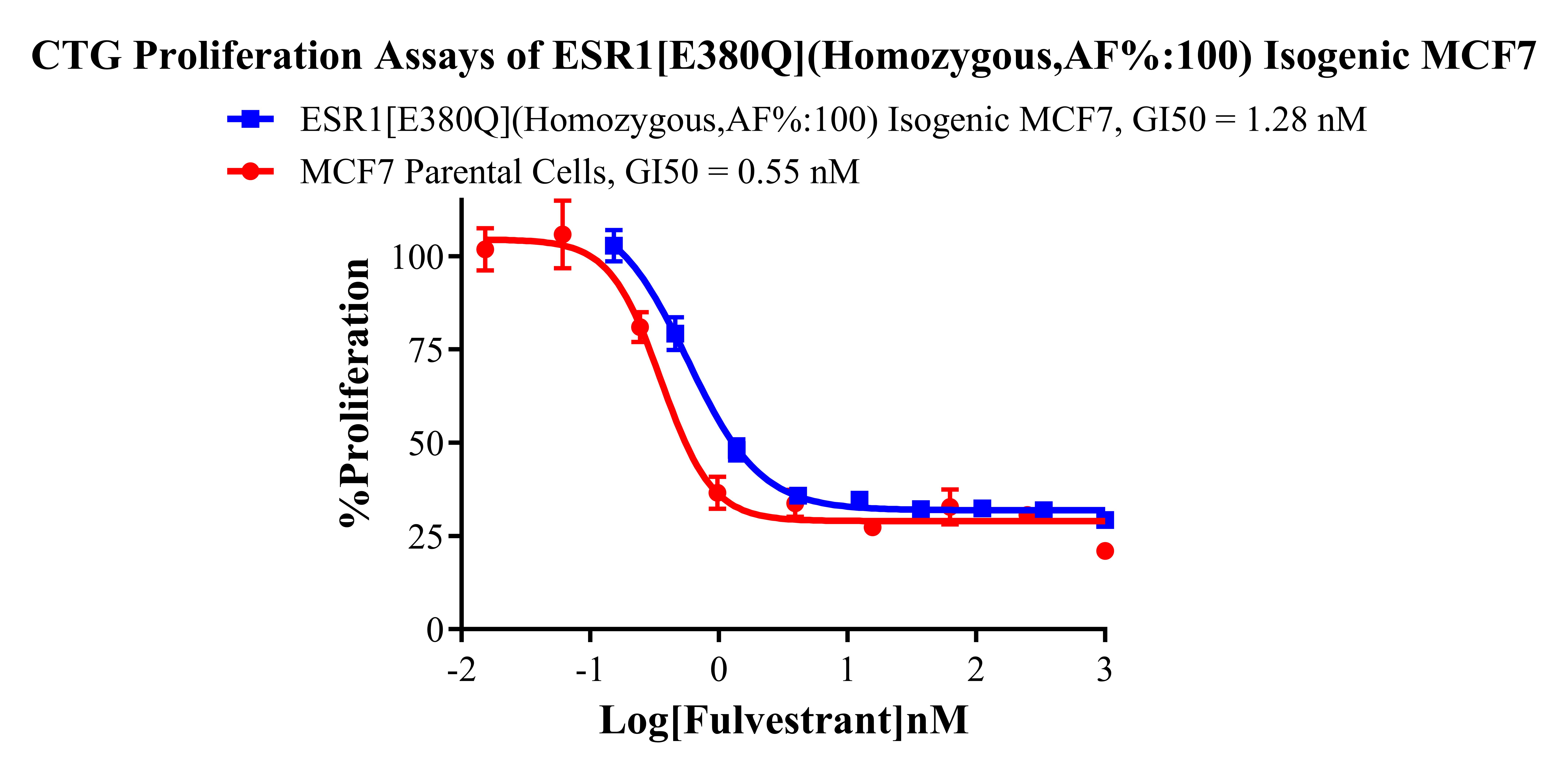 ![]() Figure 1. A: MCF7 Parental Cell;B:ESR1[E380Q] (Homozygous,AF%:100) Isogenic MCF7 通道2 藍(lán)色微滴代表ESR1[E380Q]突變陽性,通道2 綠色微滴代表該位點(diǎn)為陰性野生型 ![]() Figure 2. CTG Proliferation Assays of ESR1[E380Q](Homozygous,AF%:100) Isogenie MCF7. |
