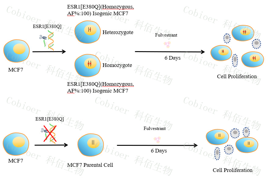 ESR1[E380Q](Homozygous,AF%:100) Isogenic MCF7 藥靶細(xì)胞,通過基因編輯的方式將 ESR1 的 380 位氨基酸谷氨酸(E)突變?yōu)楣劝滨0罚≦)。![]() 圖 1: ESR1[E380Q](Homozygous,AF%:100) Isogenic MCF7 細(xì)胞的構(gòu)建原理圖
