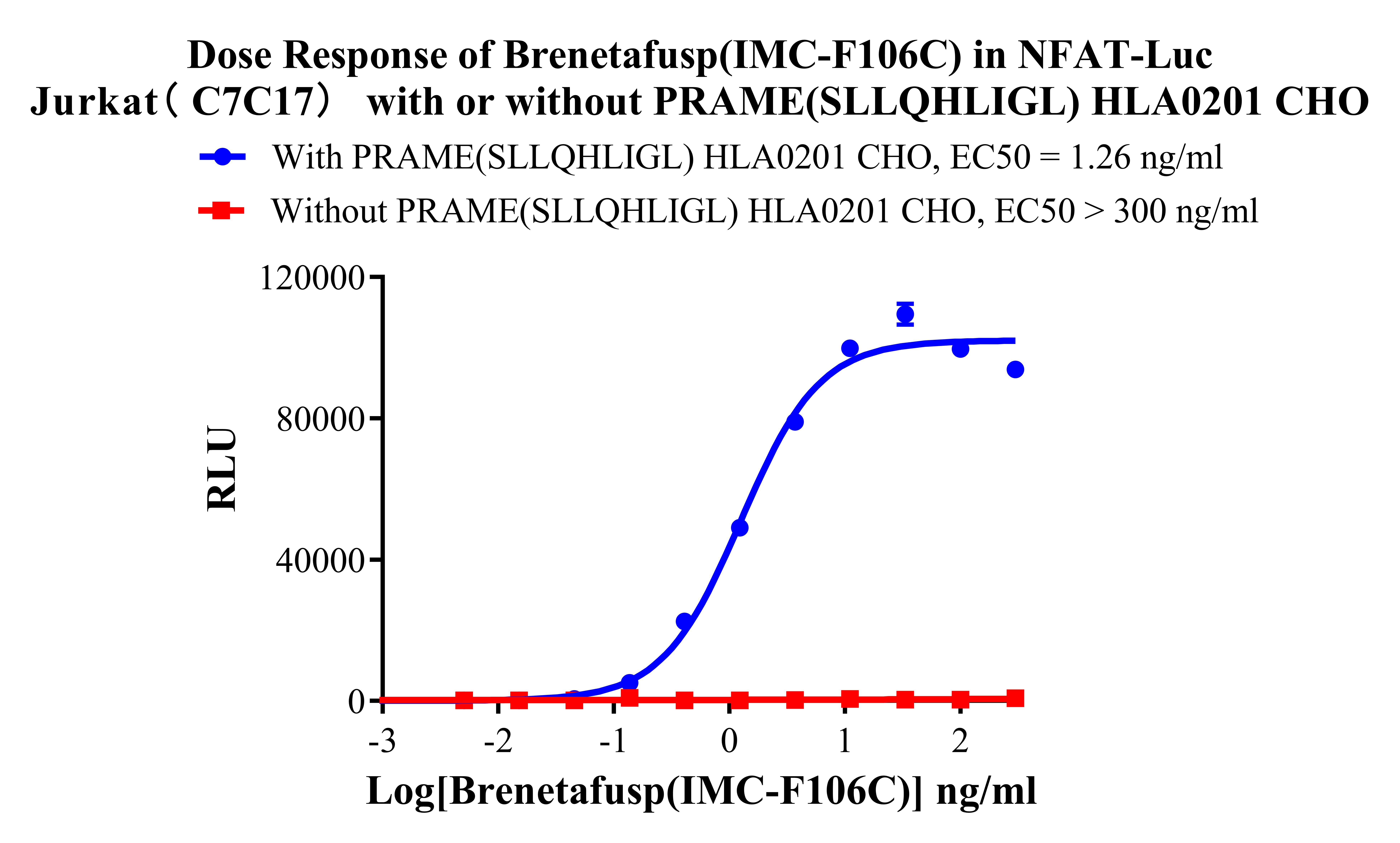 Figure 2. Dose Response of Brenetafusp (IMC-F106C)in NFAT-Luc Jurkat( C7C17) with or without PRAME(SLLQHLIGL) HLA0201 CHO. |