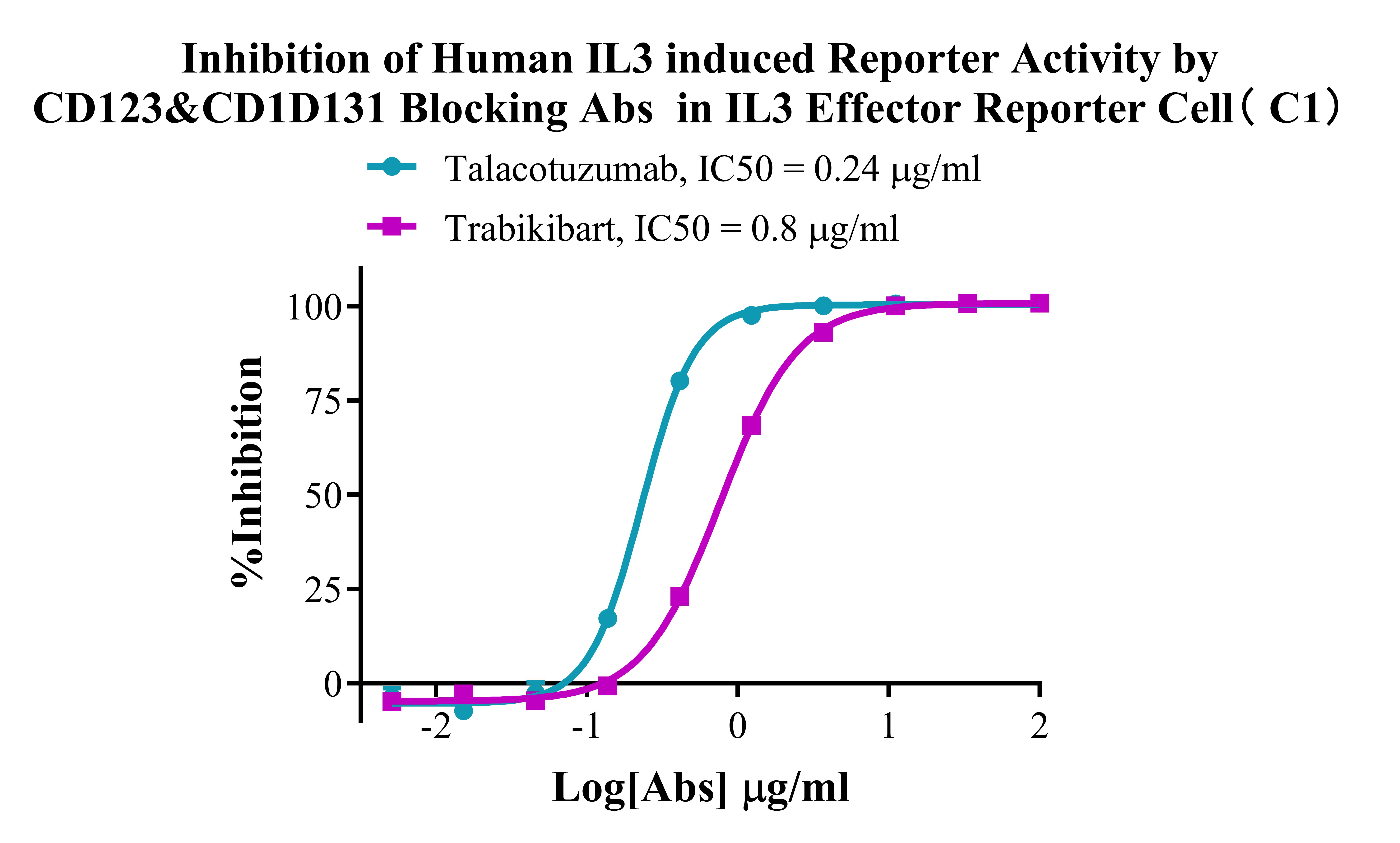 ![]() Figure 2. Recombinant IL3 Effector Reporter Cell stably expressing CD123 &CD131. ![]() Figure 3. Dose Response of Recombinant Human IL3 in IL3 Effector Reporter Cell(C1). ![]() Figure 4. Inhibition of Human IL3 induced Reporter Activity by CD123&CD1D131 Blocking Abs in IL3 Effector Reporter Cell(C1). |