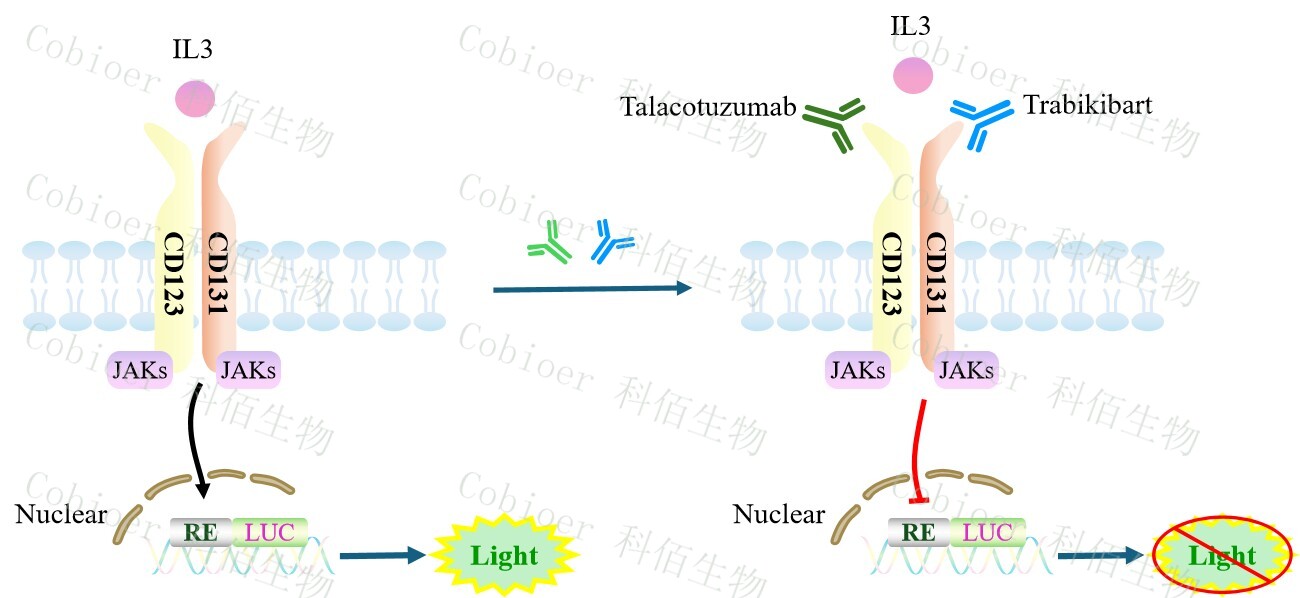 IL3 Effector Reporter Cell 報告基因藥靶模型很好的模擬了體內(nèi) IL3 的信號轉(zhuǎn)導過程,原理見下圖所示。![]() Figure 1. IL3 Effector Reporter Cell 細胞模型原理圖 |
