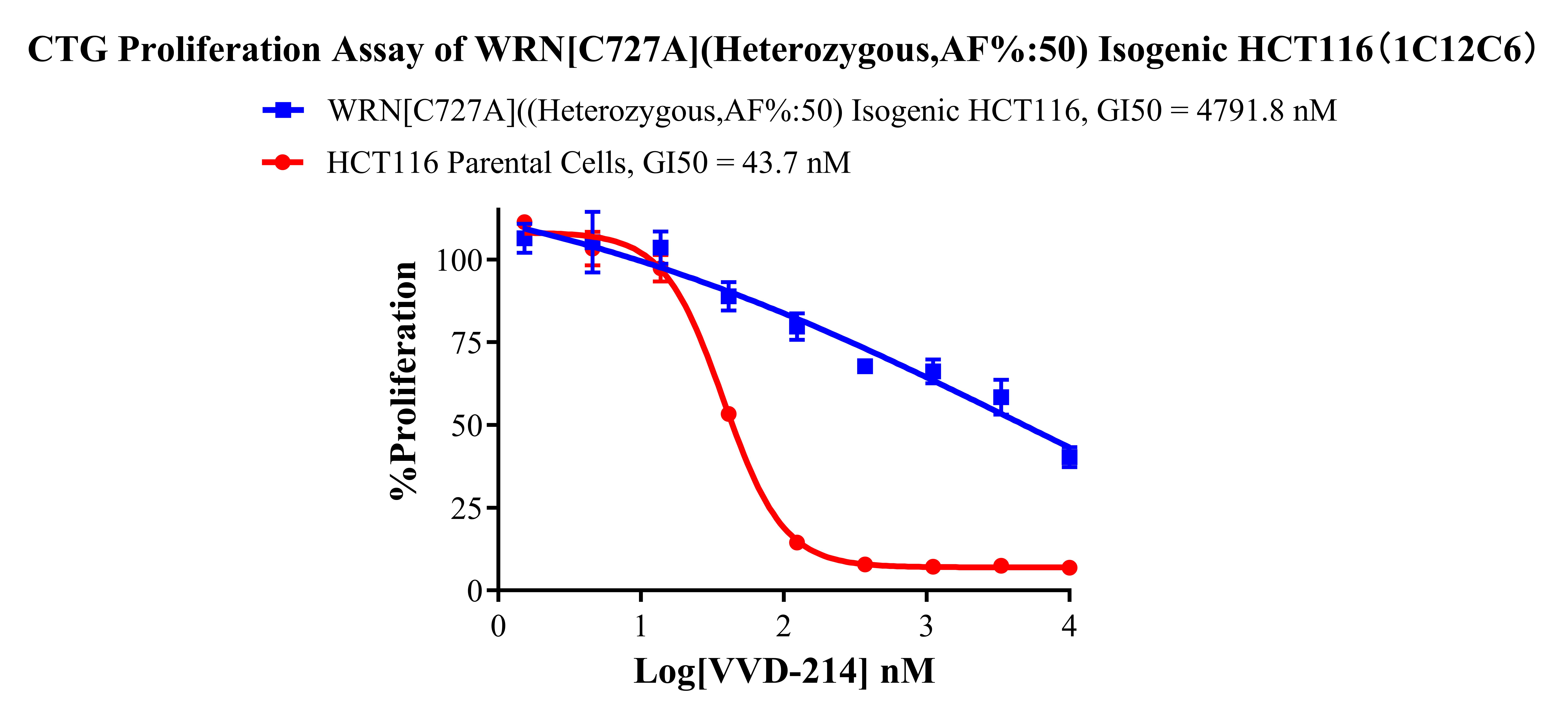 Figure 2. Sanger of WRN[C727A](Heterozygous,AF%:50) Isogenic HCT116![]() Figure 3. A:HCT116 Parental Cell;B:WRN[C727A](Heterozygous,AF%:50) Isogenic HCT116 通道2 藍(lán)色微滴代表WRN[C727A]突變陽性,通道2 綠色微滴代表該位點(diǎn)為陰性野生型 ![]() Figure 4. CTG Proliferation Assay of WRN[C727A](Heterozygous,AF%:50) Isogenic HCT116(1C12C6). ![]() Figure 5. CTC Proliferation Assay of WRN[C727A](Heterozygous,AF%:50) lsogenic HCT116(1C12C6). |