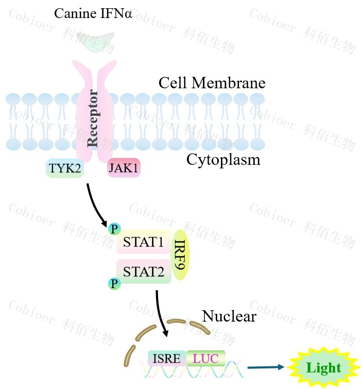 Canine IFNα&β Effector Reporter Cell 報告基因細胞,是由調控因子調控 并表達 Luc 熒光素酶報告基因的重組細胞。IFNα與受體結合,激活 ISRE 的原理見下圖所示。![]() Figure 1. Canine IFNα&β Effector Reporter Cell 細胞模型原理圖 |
