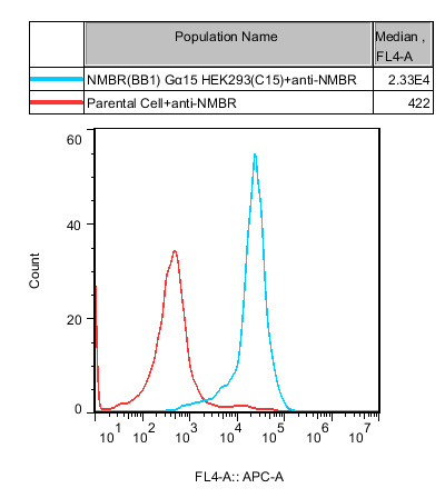 NMBR(BB1) Gα15 HEK293 細(xì)胞藥靶模型很好的模擬了體內(nèi) NMBR(BB1)&Gα15 的信號(hào)轉(zhuǎn)導(dǎo)過程,原理見下圖所示。![]() Figure 1. NMBR(BB1) Gα15 HEK293 細(xì)胞模型原理圖 |