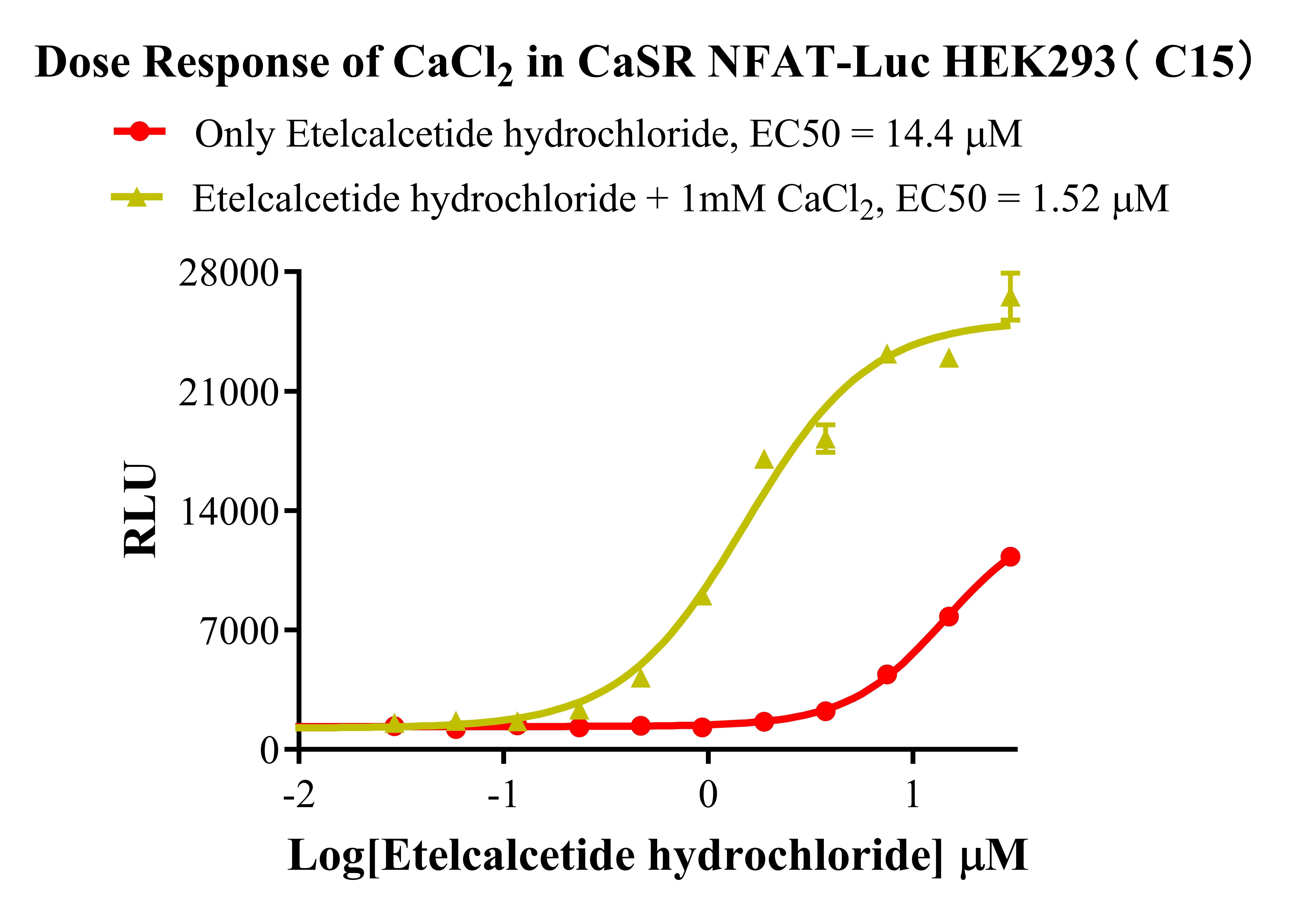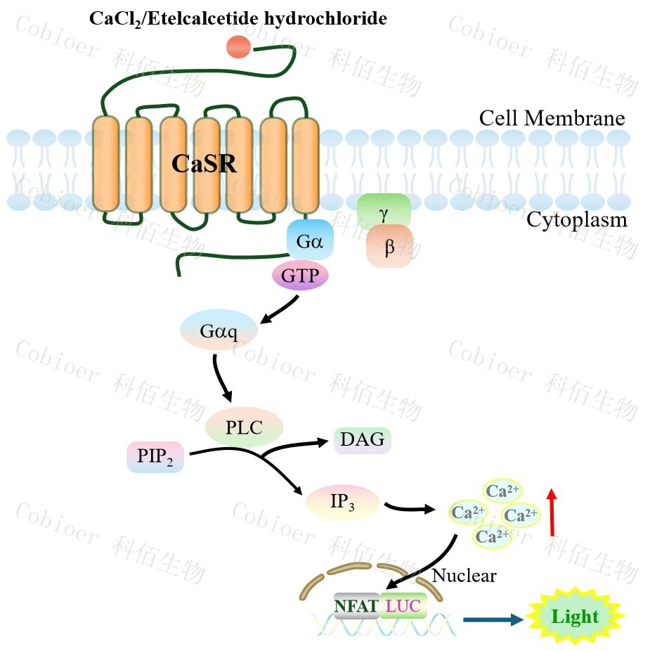CaSR NFAT-Luc HEK293 細胞藥靶模型很好的模擬了體內(nèi) CaSR 的信號轉(zhuǎn)導(dǎo)過程,原 理見下圖所示。![]() Figure 1. CaSR NFAT-Luc HEK293 細胞模型原理圖 |