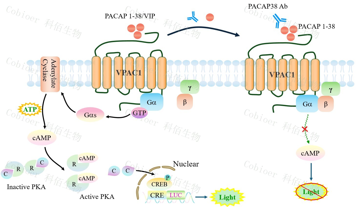 VPAC1 CRE-Luc CHO 報告基因藥靶模型很好的模擬了體內(nèi) VPAC1 的信號轉(zhuǎn)導(dǎo)過程, 原理見下圖所示。![]() Figure 1. VPAC1 CRE-Luc CHO 細(xì)胞模型原理圖 |