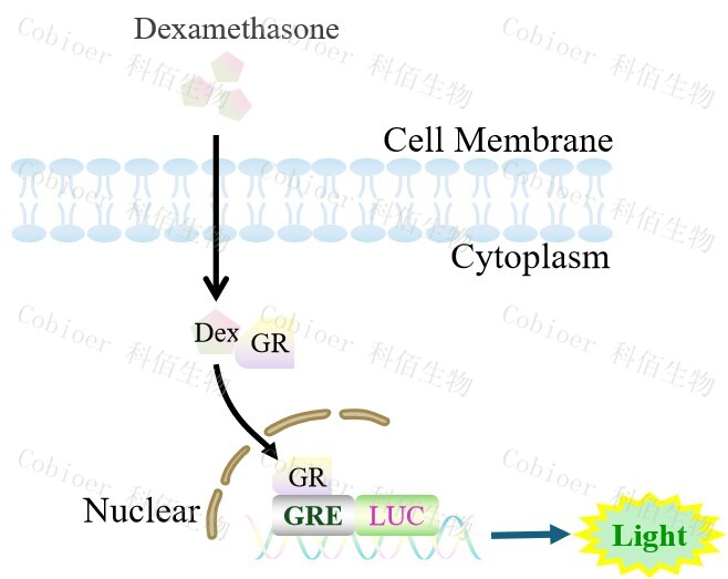 GRE-Luc HEK293 報(bào)告基因細(xì)胞,是由 GRE 調(diào)控并表達(dá) Luc 熒光素酶 報(bào)告基因的 HEK293 細(xì)胞。Dexamethasone (Hexadecadrol,地塞米松)是糖皮質(zhì)激素受體 (Glucocorticoid Receptor)激動劑、凋亡誘導(dǎo)劑,原理見下圖所示。![]() Figure 1. GRE-Luc HEK293 細(xì)胞原理示意圖 |