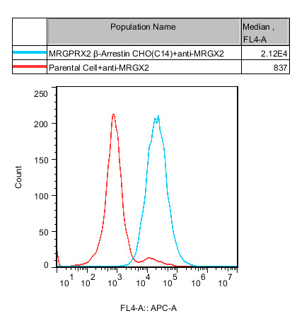 MRGPRX2 β-Arrestin CHO 報(bào)告基因藥靶模型很好的模擬了體內(nèi) MRGPRX2/β-Arrestin 的信號(hào)轉(zhuǎn)導(dǎo)過(guò)程,原理見(jiàn)下圖所示。當(dāng)缺乏配體刺激時(shí),β-Arrestin 不與 MRGPRX2 結(jié)合, 融合β-Arrestin 的熒光素酶處于失活構(gòu)象;當(dāng) MRGPRX2 遭遇配體刺激時(shí),融合熒光素酶報(bào) 告基因的β-Arrestin 被招募,使熒光素酶報(bào)告基因處于激活狀態(tài),加入其底物后發(fā)光信號(hào)增 強(qiáng)。![]() Figure 1. MRGPRX2 β-Arrestin CHO 細(xì)胞模型原理圖 |