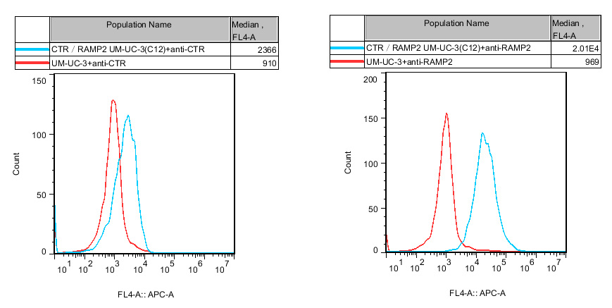 CTR&RAMP2 UM-UC-3 細胞藥靶模型很好的模擬了體內(nèi) CTR&RAMP2 的信號轉(zhuǎn)導(dǎo)過程,原理見下圖所示。![]() Figure 1. CTR&RAMP2 UM-UC-3 細胞流式驗證 CTR 和 RAMP2 的表達 |