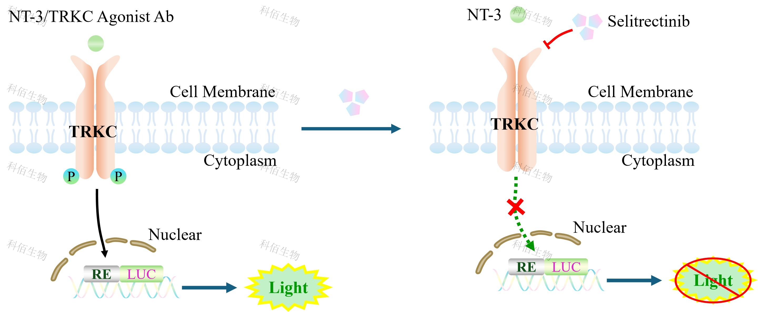 TRKC Effector Reporter Cell 報(bào)告基因藥靶模型很好的模擬了體內(nèi) TRKC 的信號(hào)轉(zhuǎn)導(dǎo)過(guò)程,原理見(jiàn)下圖所示。![]() Figure 1. TRKC Effector Reporter Cell 模型原理圖 |