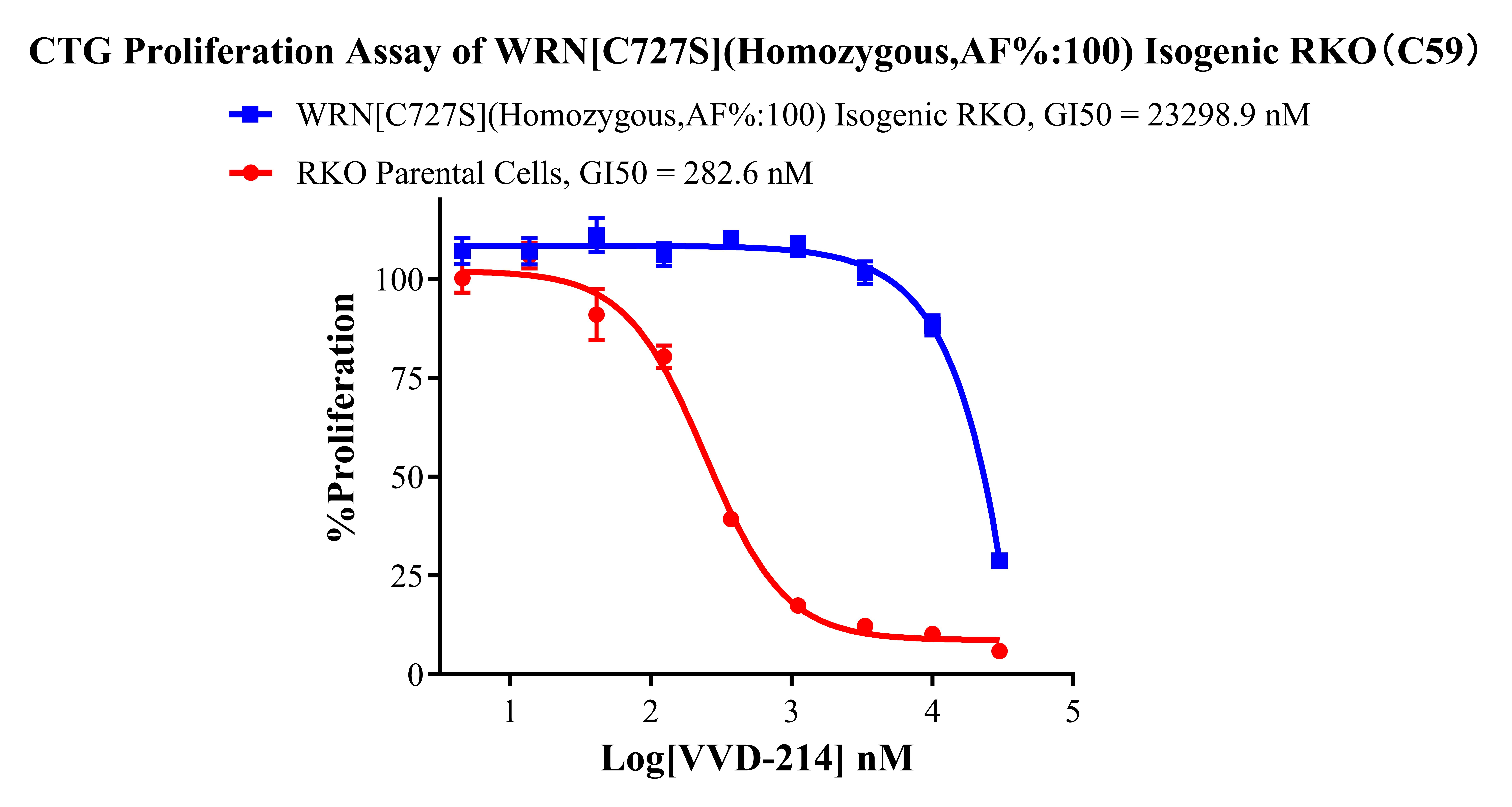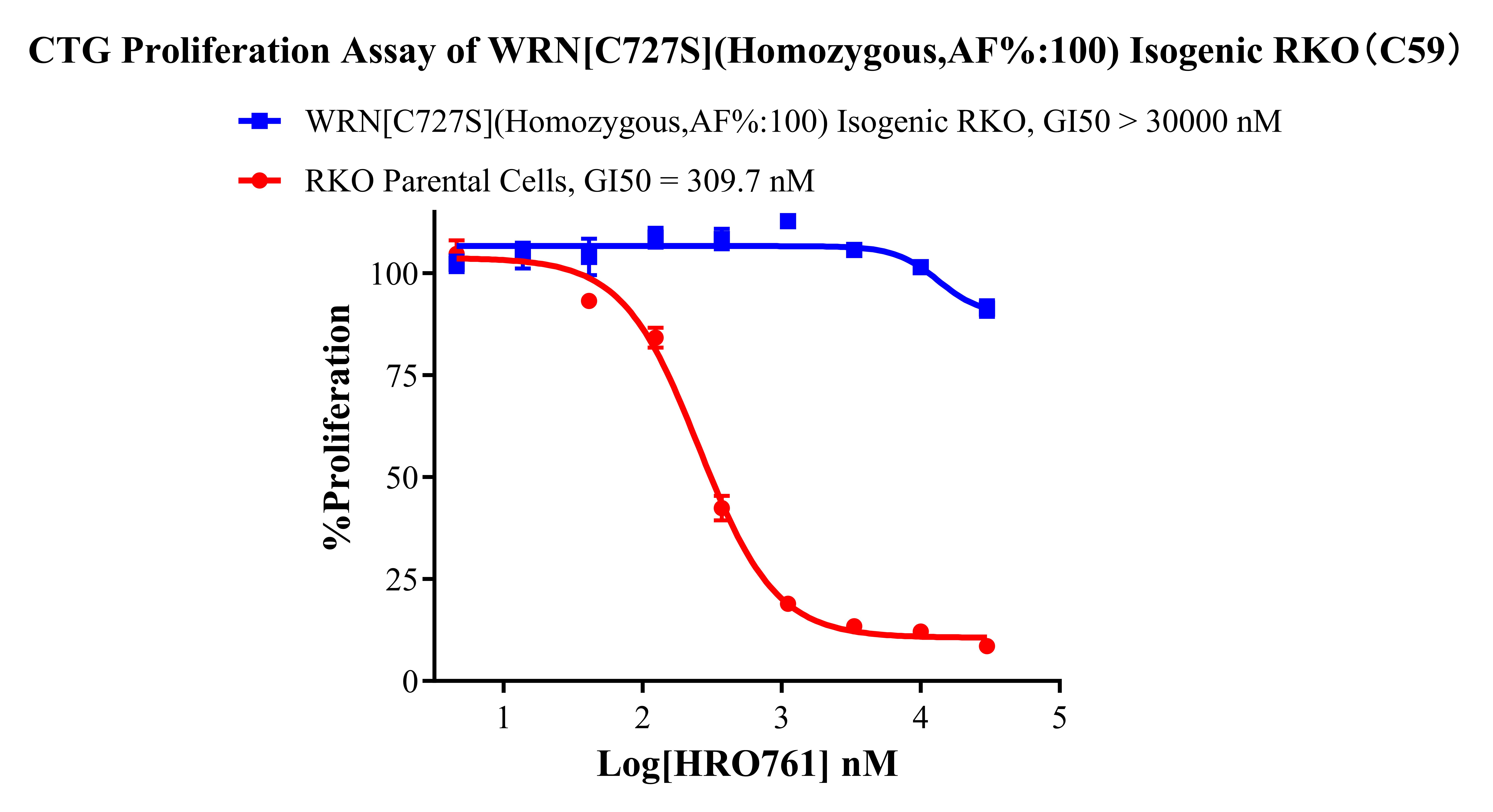 ![]() Figure 1. A:RKO Parental Cell;B:WRN[C727S](Homozygous,AF%:100) Isogenic RKO 通道1 藍(lán)色微滴代表WRN[C727A]突變陽性,通道2 綠色微滴代表該位點為陰性野生型 ![]() Figure 2. CTG Proliferation Assay of WRN[C727S](Homozygous,AF%:100) Isogenic RKO(C59). ![]() Figure 3. CTG Proliferation Assay of WRN[C727S](Homozygous,AF%:100) Isogenic RKO(C59). |
