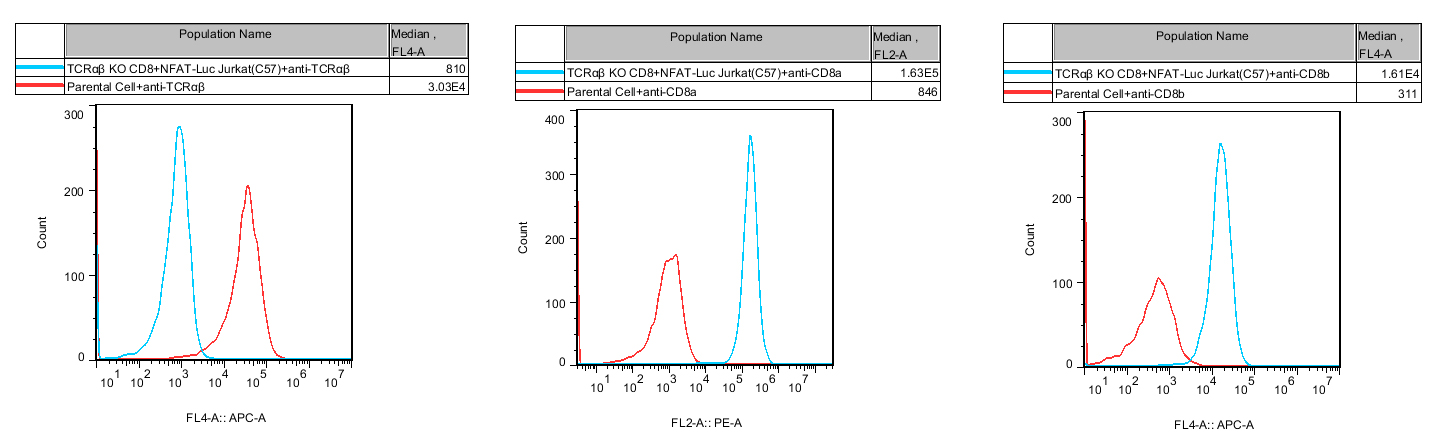 ![]() Figure 1. TCRαβ KO CD8+ NFAT-Luc Jurkat 細(xì)胞,在 NFAT-Luc Jurkat 細(xì)胞上敲除 TCRαβ,表達(dá)CD8。 |