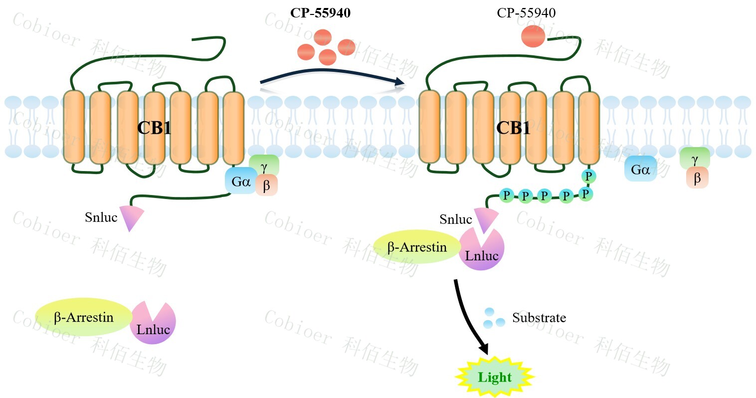 CB1 β-Arrestin CHO 報告基因藥靶模型很好的模擬了體內(nèi) CB1/β-Arrestin 的信號轉(zhuǎn)導(dǎo)過 程,原理見下圖所示。當缺乏配體刺激時,β-Arrestin 不與 CB1 結(jié)合,融合β-Arrestin 的熒 光素酶處于失活構(gòu)象,當 CB1 遭遇配體刺激時,融合熒光素酶報告基因的β-Arrestin 被招 募,使熒光素酶報告基因處于激活狀態(tài),加入其底物后發(fā)光信號增強。![]() Figure 1. CB1 β-Arrestin CHO 細胞模型原理圖 |