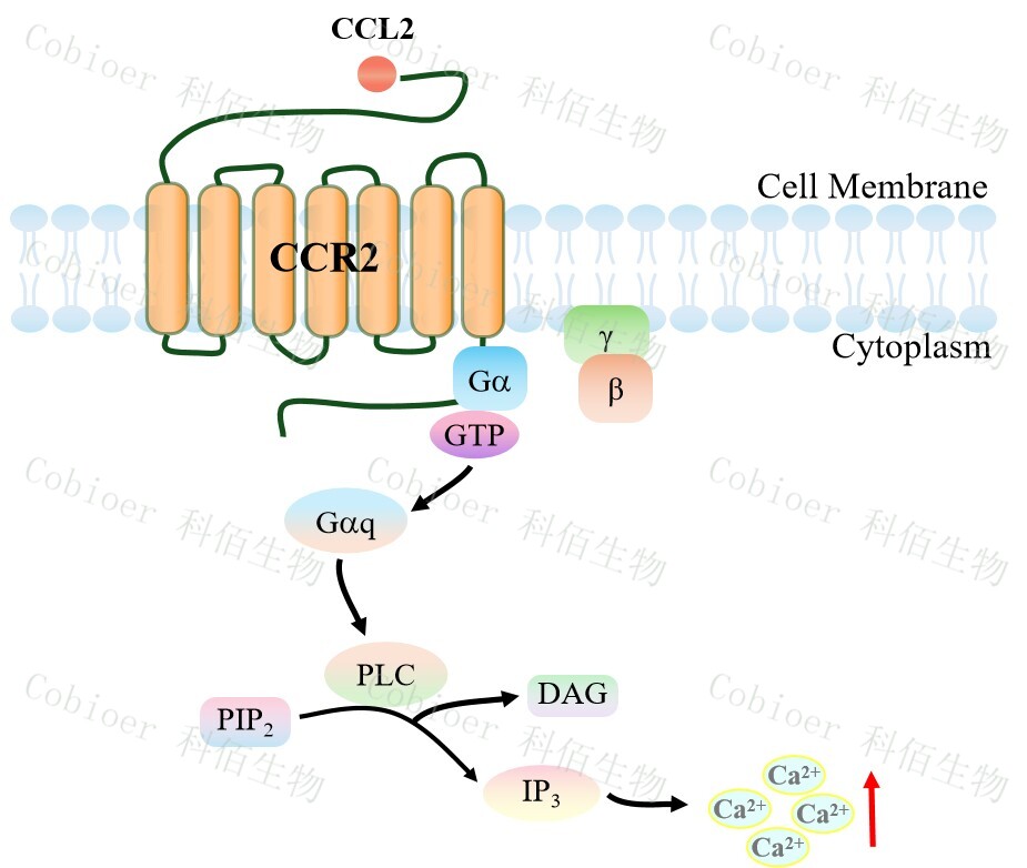 CCR2 與配體結(jié)合,導(dǎo)致 Gαq 亞基的激活,觸發(fā) PLC-γ,從而產(chǎn)生兩個(gè)第二信使:IP3 和 DAG,它們參與細(xì)胞內(nèi)鈣動員。