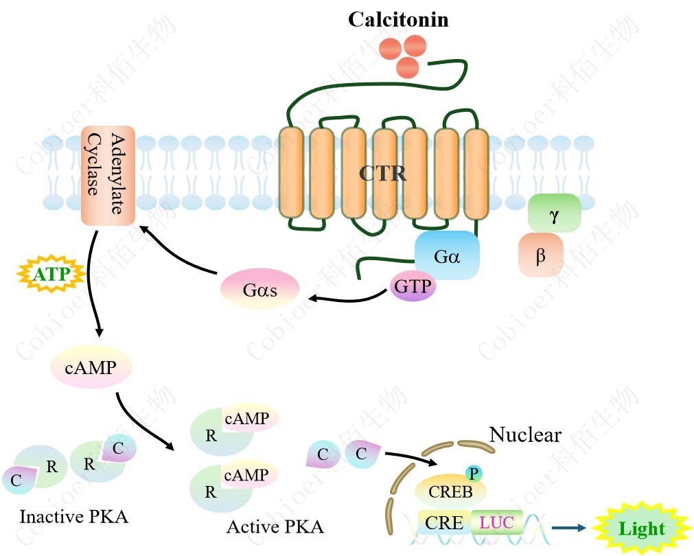 CTR(CALCR) CRE-Luc HEK293 報告基因藥靶模型很好的模擬了體內(nèi) CTR 的信號轉(zhuǎn)導過程,原理見下圖所示。![]() Figure 1. CTR(CALCR) CRE-Luc HEK293 細胞模型原理圖 |
