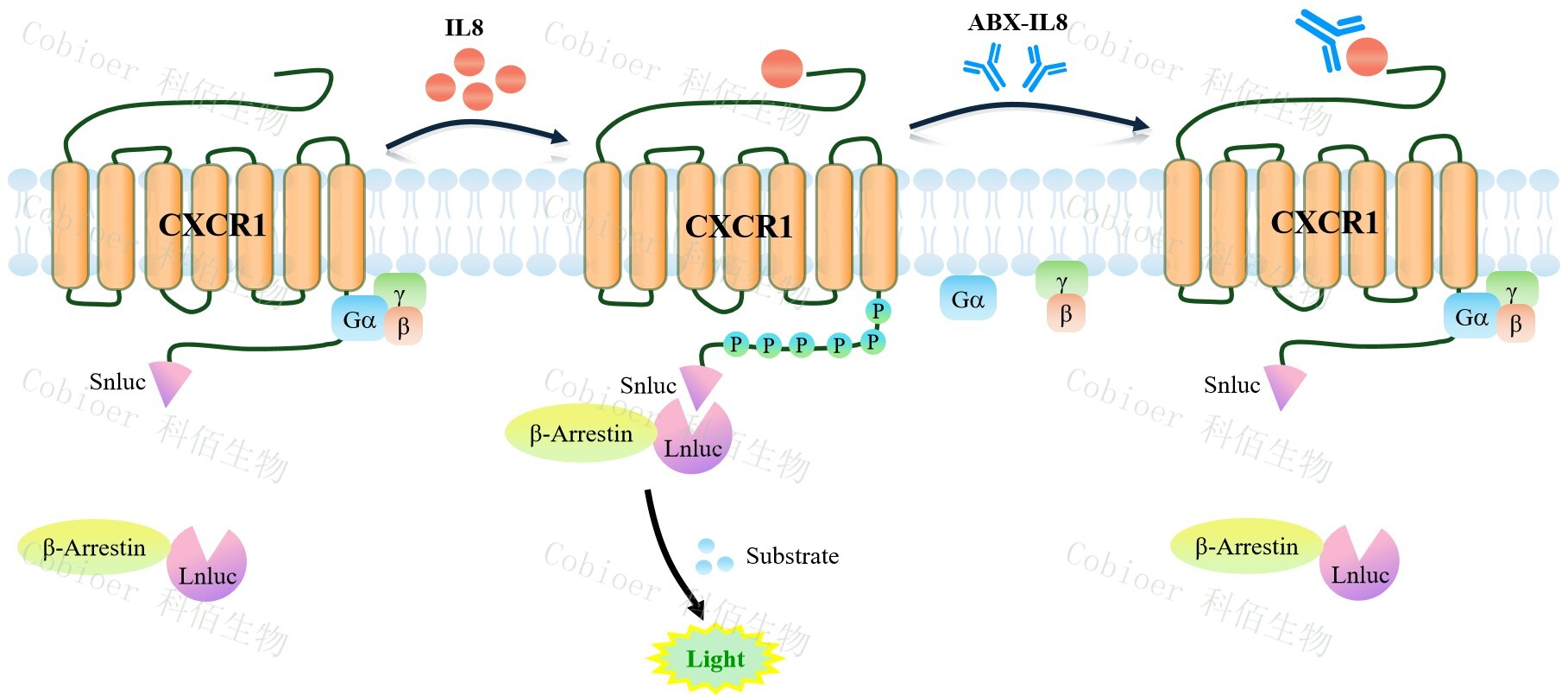 CXCR1 β-Arrestin CHO 報告基因藥靶模型很好的模擬了體內(nèi) CXCR1/β-Arrestin 的信號轉(zhuǎn)導(dǎo)過程,原理見下圖所示。當缺乏配體刺激時,β-Arrestin 不與 CXCR1 結(jié)合,融合β- Arrestin 的熒光素酶處于失活構(gòu)象,當 CXCR1 遭遇配體刺激時,融合熒光素酶報告基因的 β-Arrestin 被招募,使熒光素酶報告基因處于激活狀態(tài),加入其底物后發(fā)光信號增強。![]() Figure 1. CXCR1 β-Arrestin CHO 細胞模型原理圖 |