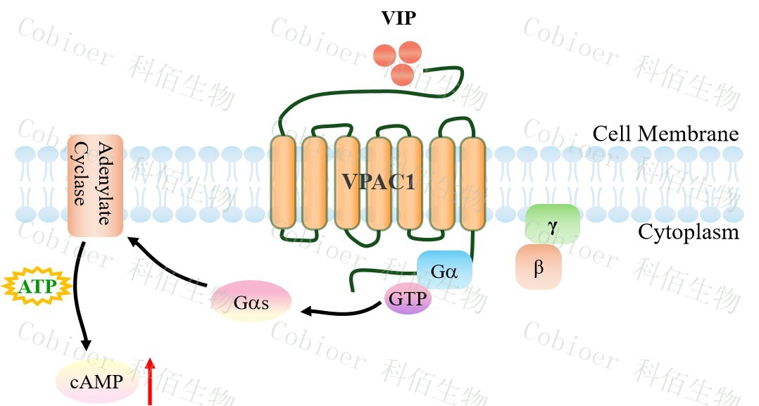 | PACAP/VIP 受體家族屬于 B 類(lèi) G 蛋白偶聯(lián)受體(GPCR),包含 PAC1R (PAC1)、 VPAC1R (VPAC1) 和 VPAC2R (VPAC2) 三個(gè)亞型,共同響應(yīng)神經(jīng)肽 PACAP(垂體腺苷酸 環(huán)化酶激活肽)和 VIP(血管活性腸肽)的調(diào)控,通過(guò)激活 Gs/cAMP-PKA 核心信號(hào)軸 (部分亞型偶聯(lián) Gq/PLC)廣泛協(xié)調(diào)神經(jīng)內(nèi)分泌、代謝穩(wěn)態(tài)與免疫調(diào)節(jié)。 VPAC1 受體(血管活性腸肽受體 1 型) 作為 B 類(lèi) GPCR 家族的核心成員,主要在免 疫細(xì)胞、胃腸道及呼吸道高表達(dá),以?xún)?nèi)源性配體血管活性腸肽(VIP) 和垂體腺苷酸環(huán)化 酶激活肽(PACAP) 為高親和力激活源,通過(guò)專(zhuān)一性偶聯(lián) Gs/cAMP-PKA 信號(hào)軸發(fā)揮關(guān)鍵 生理調(diào)控作用。VPAC1 的激活可抑制巨噬細(xì)胞炎癥因子釋放(如 TNF-α、IL-12)、促進(jìn)腸 道平滑肌舒張與上皮屏障修復(fù)、擴(kuò)張支氣管并抑制黏液分泌,從而維持免疫耐受、胃腸動(dòng) 力及呼吸穩(wěn)態(tài)。VPAC1 功能缺陷已被證實(shí)與炎癥性腸?。↖BD)、哮喘和類(lèi)風(fēng)濕關(guān)節(jié)炎的 病理進(jìn)程密切相關(guān),而靶向激動(dòng)劑在急性呼吸窘迫綜合征(ARDS)與 IBD 治療中已展現(xiàn) 顯著療效,凸顯其作為免疫-黏膜穩(wěn)態(tài)核心調(diào)節(jié)器的治療價(jià)值。 |