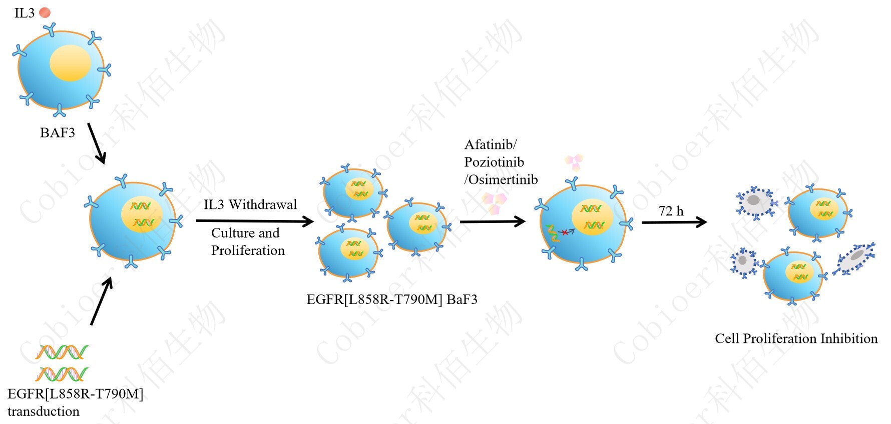 BaF3(小鼠原 B 細胞)的生長和增殖需要 IL-3 的維持。通過引入各種表達激酶的基因, 能作為 BaF3 的驅(qū)動基因,讓 BaF3 不再依賴 IL-3 而增殖,進而激酶基因成為 BaF3 增殖依 賴的驅(qū)動基因,用于評估小分子藥物對激酶的靶向抑制作用,原理及流程見下圖所示。