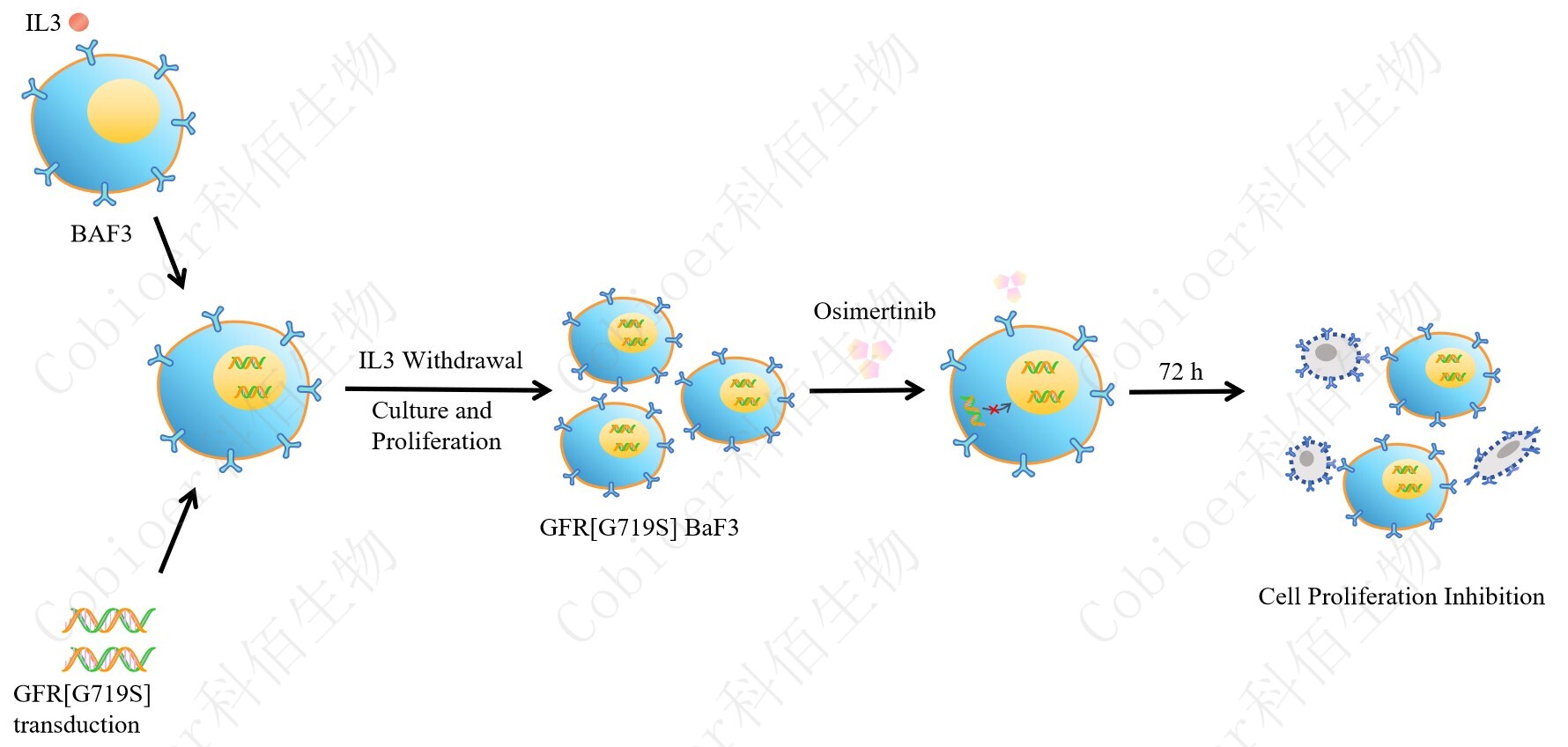 BaF3(小鼠原 B 細(xì)胞)的生長(zhǎng)和增殖需要 IL-3 的維持。通過(guò)引入各種表達(dá)激酶的基因, 能作為 BaF3 的驅(qū)動(dòng)基因,讓 BaF3 不再依賴 IL-3 而增殖,進(jìn)而激酶基因成為 BaF3 增殖依 賴的驅(qū)動(dòng)基因,用于評(píng)估小分子藥物對(duì)激酶的靶向抑制作用,原理及流程見下圖所示。