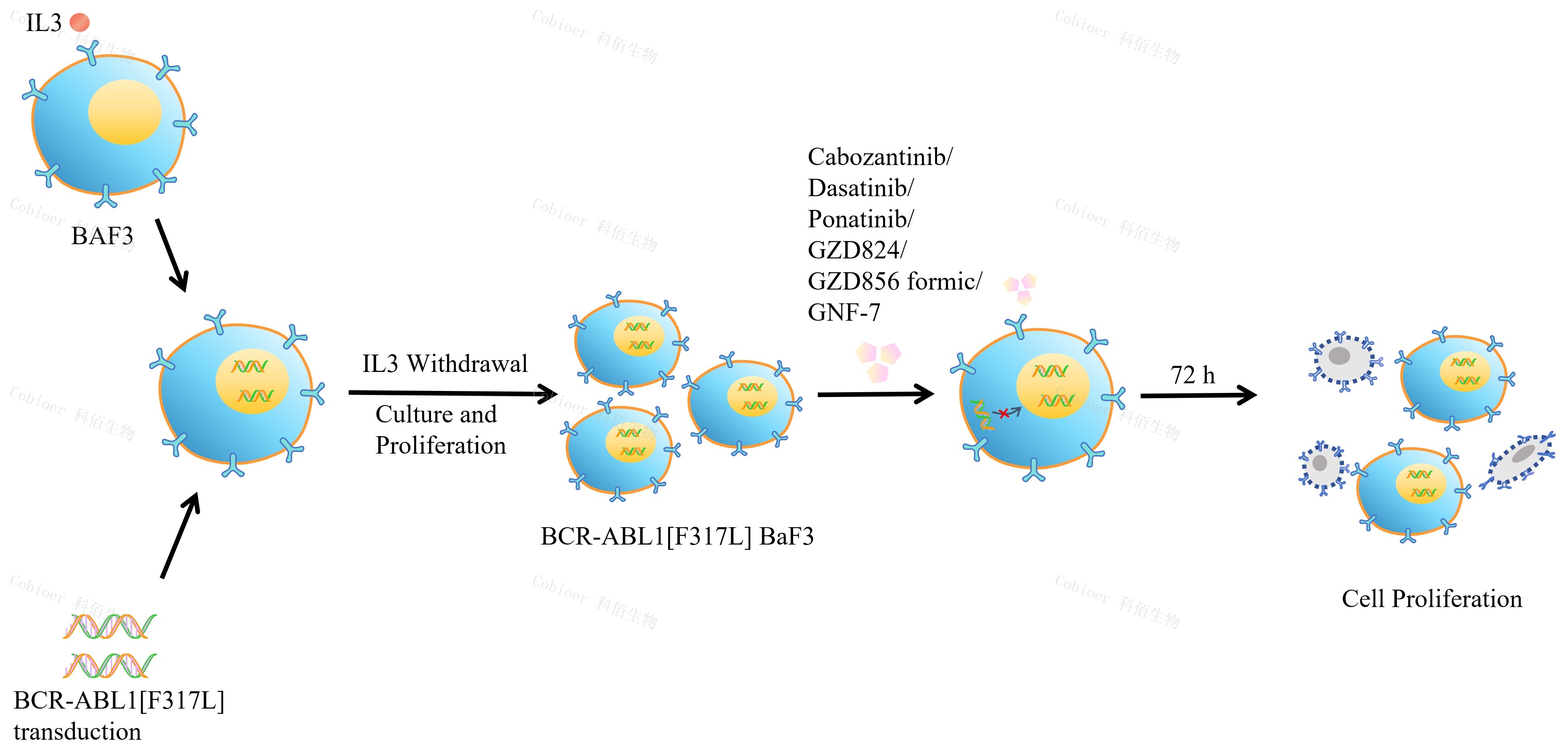 | BCR-ABL1[F317L] BaF3 藥靶細胞 , 通過轉導突變狀態(tài)的 BCR- ABL1[F317L]基因到 BaF3 細胞系中,穩(wěn)定表達人突變形態(tài)下的 BCR-ABL1[F317L]基因。 BaF3(小鼠原 B 細胞)的生長和增殖需要 IL-3 的維持。通過引入各種表達激酶的基因, 能作為 BaF3 的驅動基因,讓 BaF3 不再依賴 IL-3 而增殖,進而激酶基因成為 BaF3 增殖依賴的驅動基因,用于評估小分子藥物對激酶的靶向抑制作用,原理及流程見下圖所示。 ![]() Figure 1. BCR-ABL1[F317L] BaF3 細胞的構建原理圖 |