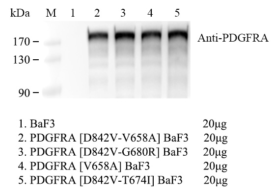 PDGFRA[D842V_T674I] BaF3 藥靶細(xì)胞,通過轉(zhuǎn)導(dǎo)突變狀態(tài)的 PDGFRA[D842V_T674I] 基因到 BaF3 細(xì)胞系中,穩(wěn)定表達(dá) 人突變形態(tài)下的 PDGFRA[D842V_T674I] 基因。