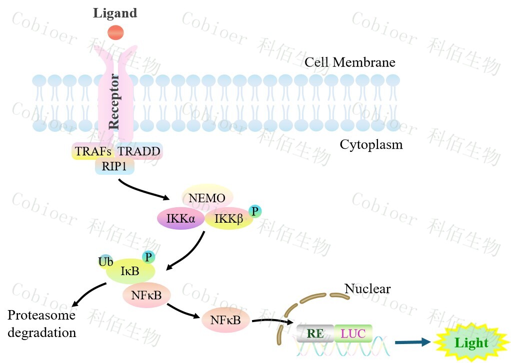 NFκB-Luc HEK293 報告基因細胞,是由 NFκB 調(diào)控并表達 Luc 熒光素酶 報告基因的 HEK293 細胞。配體與受體結(jié)合后,激活 NF-κB 的原理見下圖所示。![]() Figure 1:NFκB-Luc HEK293 細胞模型原理圖 |