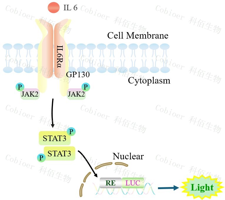 STAT3-Luc HEK293 報告基因細(xì)胞,是由 STAT3 調(diào)控并表達(dá) Luc 熒光素 酶報告基因的 HEK293 細(xì)胞。IL6 細(xì)胞因子與受體復(fù)合物結(jié)合,啟動 JAK/STAT3 信號通路,原理見下圖所示。