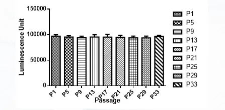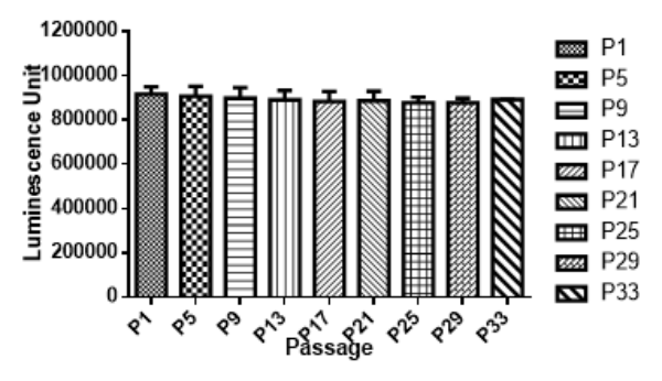 4. 示蹤細(xì)胞體外發(fā)光測試,測定發(fā)光信號強(qiáng)度和細(xì)胞傳代信號穩(wěn)定性,確保示蹤細(xì)胞在體外和體內(nèi)都能穩(wěn)定高水平表達(dá)標(biāo)記蛋白,以科佰生物A549-Luc細(xì)胞為例: