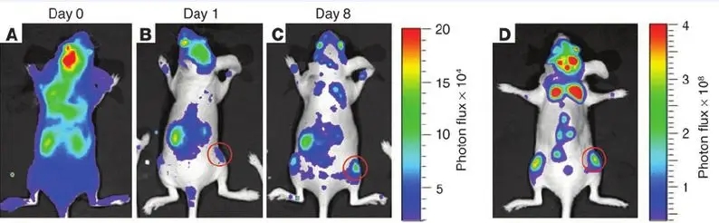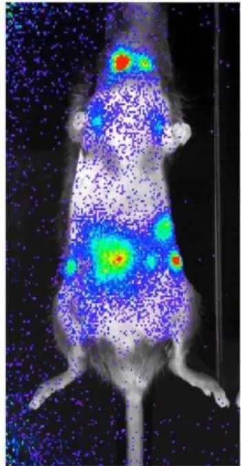 2.腫瘤轉(zhuǎn)移:由于活體成像技術(shù)直觀、靈敏度高的特點(diǎn),成為研究腫瘤轉(zhuǎn)移的重要手段。動物體內(nèi)腫瘤轉(zhuǎn)移示例:
