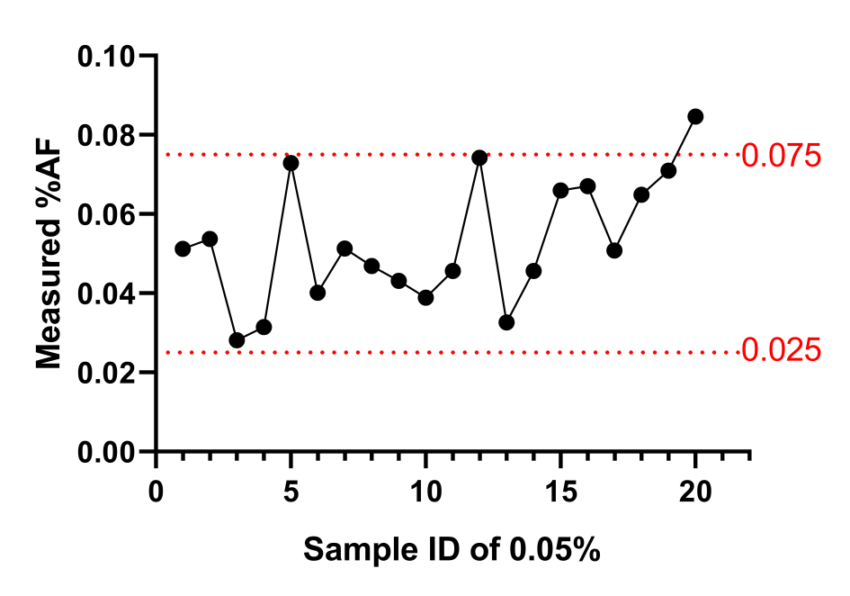 0.05%的誤差范圍是±50%,就是0.025-0.075%,因此我們選擇3個(gè)點(diǎn),探尋LOD分別為 0.010%、0.050%、0.100%,要求95%檢出。