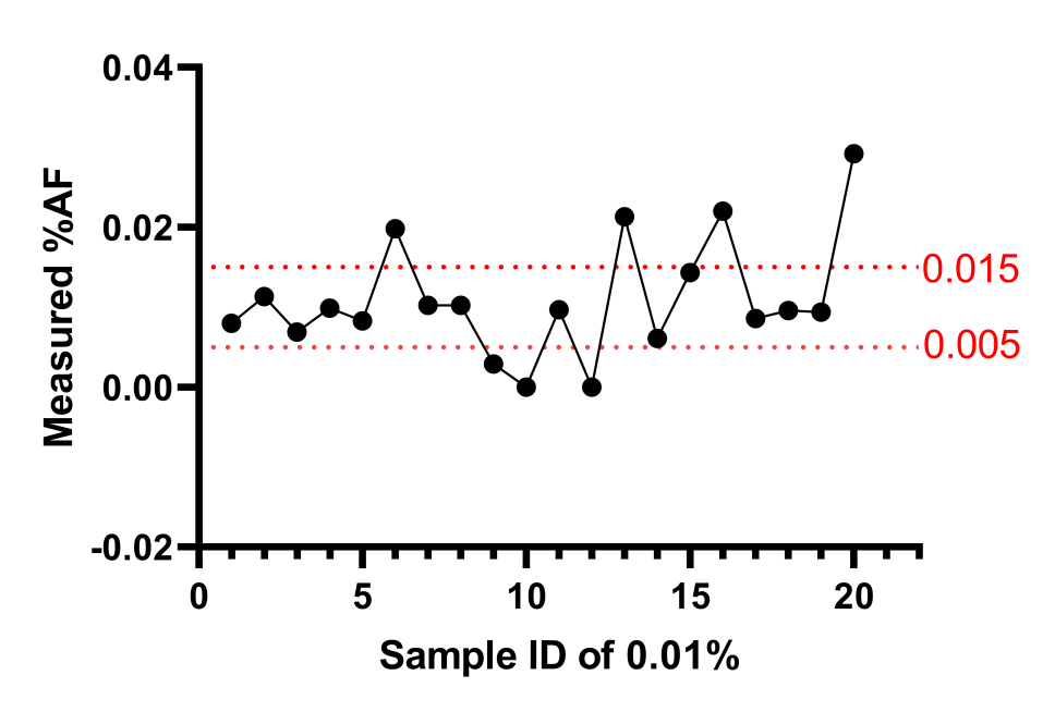 對20個(gè)0.01%的樣本進(jìn)行數(shù)字PCR檢測,觀察在0.005-0.015%以內(nèi)是否達(dá)成95%檢出。