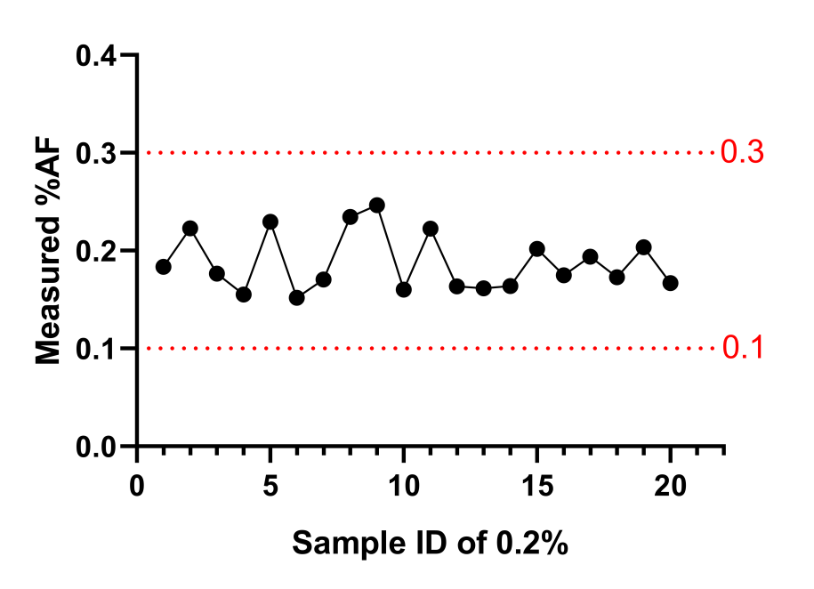 對20個(gè)0.1%的樣本進(jìn)行數(shù)字PCR檢測,觀察在0.05-0.15%以內(nèi)是否達(dá)成95%檢出。