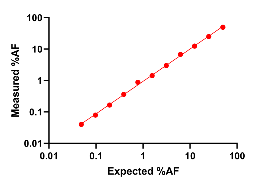 根據(jù)以上結(jié)論,我們選取10ng作為進(jìn)一步的%AF線性范圍探索,首先使用EGFR T790M的對應(yīng)的陰性標(biāo)準(zhǔn)品,對50%的標(biāo)準(zhǔn)品進(jìn)行有限稀釋,0.1%-50%間設(shè)置9個(gè)AF梯度,進(jìn)行數(shù)字PCR檢測(2復(fù)孔)。