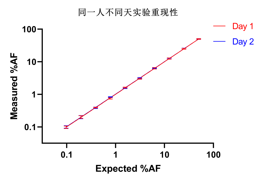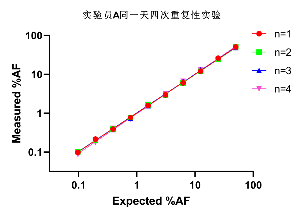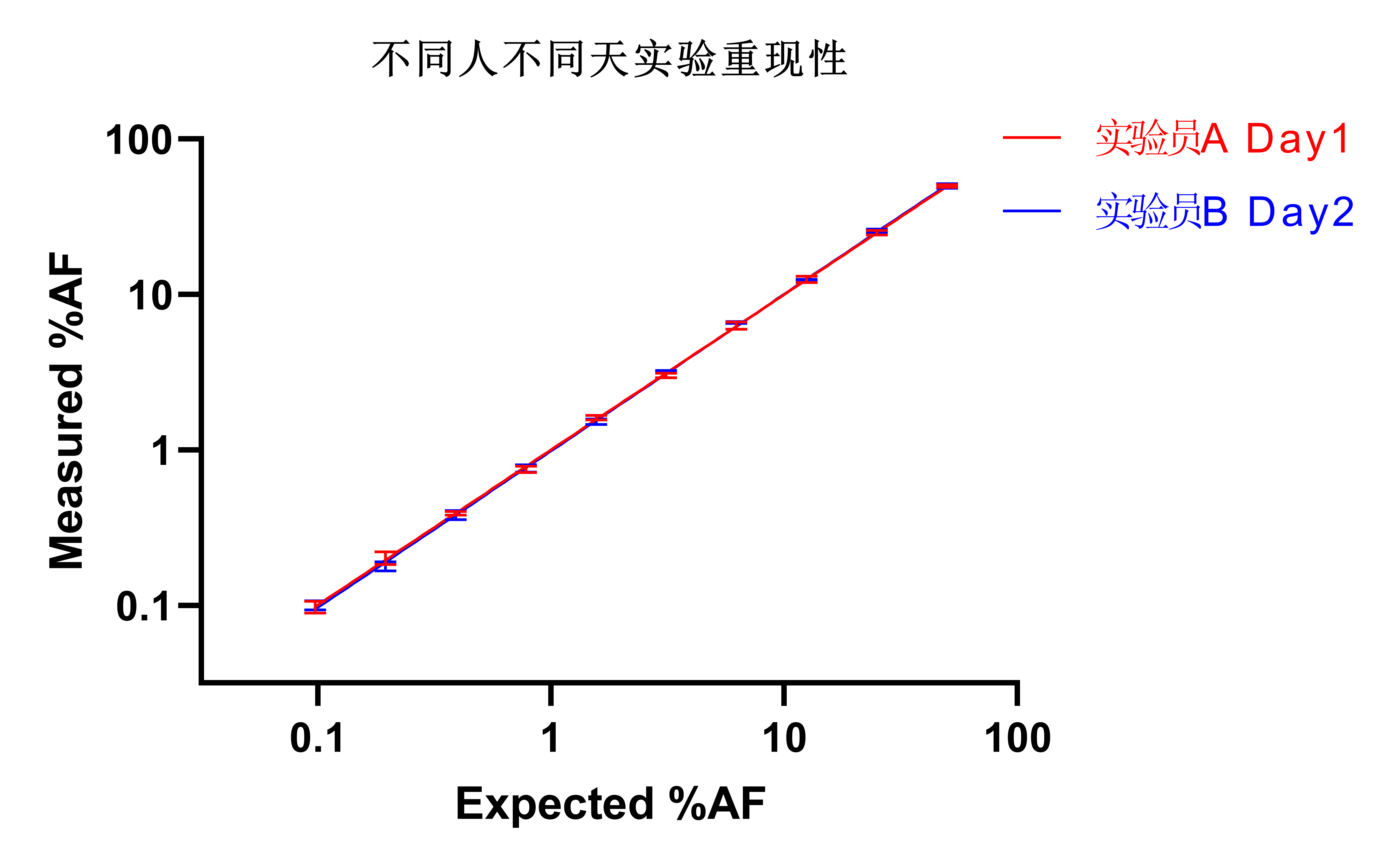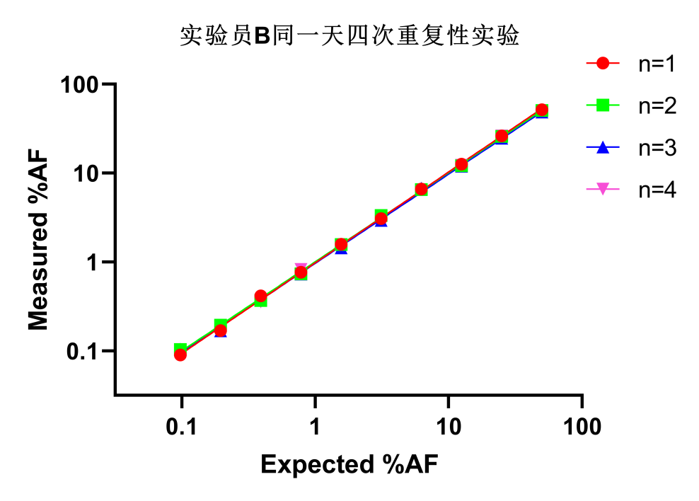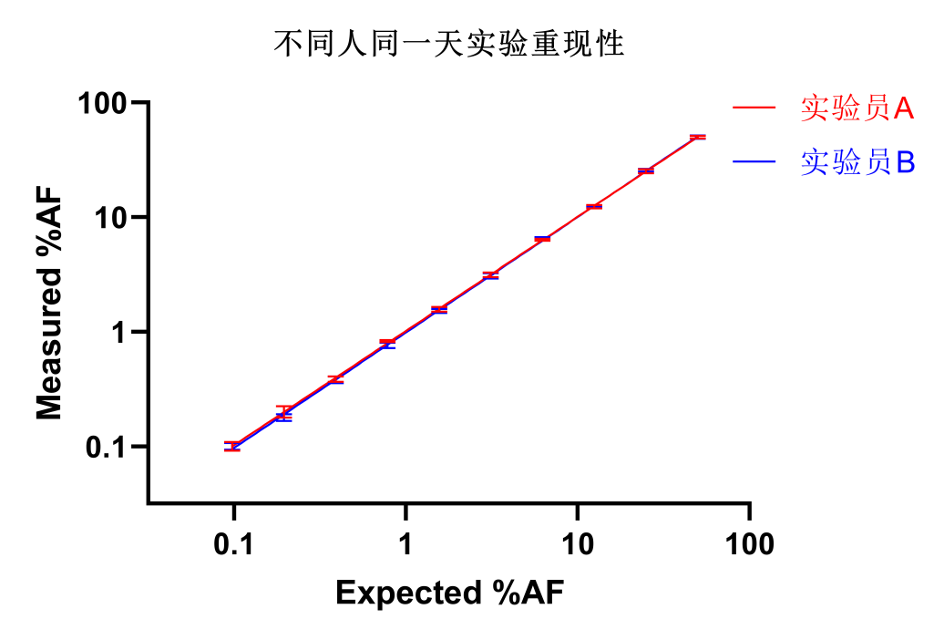 取10個(gè)不同AF(1%~50%)的標(biāo)準(zhǔn)品樣本,分別安排①實(shí)驗(yàn)員A、實(shí)驗(yàn)員B在同一天進(jìn)行每人四次實(shí)驗(yàn)測試;②實(shí)驗(yàn)員A在第一天、第二天分別進(jìn)行四次實(shí)驗(yàn)測試;③實(shí)驗(yàn)員A在第一天進(jìn)行四次實(shí)驗(yàn)測試,實(shí)驗(yàn)員B在第二天進(jìn)行四次實(shí)驗(yàn)測試。