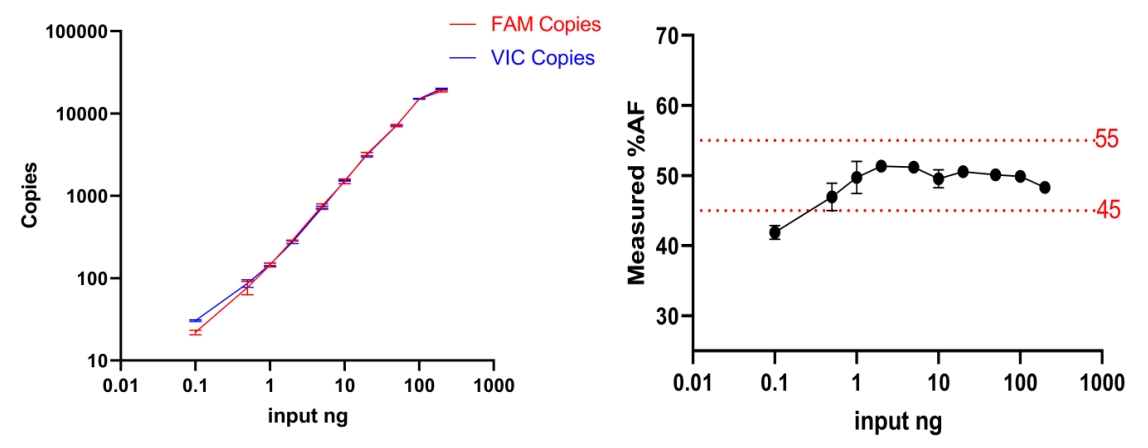 1.2 投入量在0.1ng~200ng間設(shè)置10個(gè)梯度,進(jìn)行數(shù)字PCR檢測(2復(fù)孔),判斷是否滿足%AF=50±10%波動。