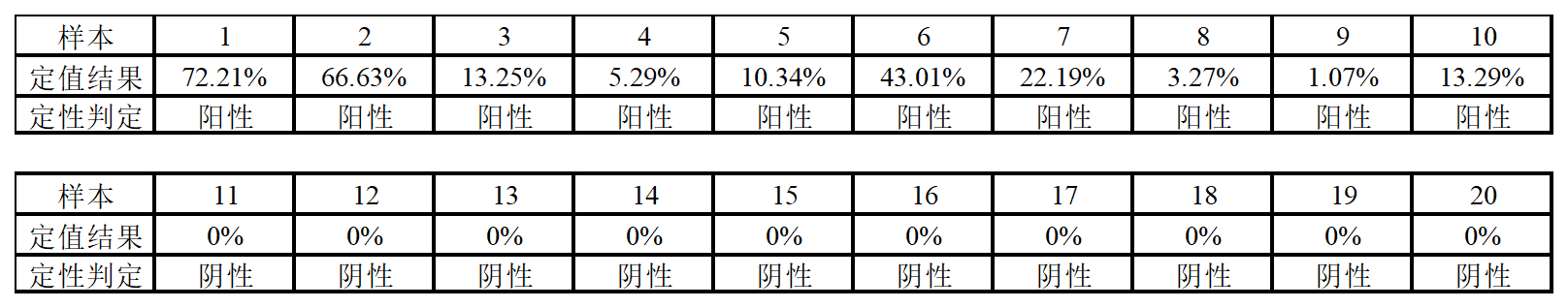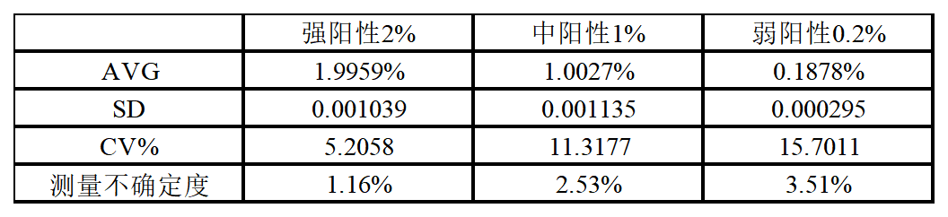 由上數(shù)據(jù)可見:強(qiáng)陽性2% 、中陽性1% 、弱陽性0.2%三種檢測體系下,誤差均在合理的范圍內(nèi),精密度良好。