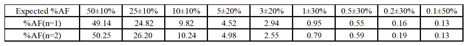 我們可以通過理論計(jì)算來預(yù)測下可能的檢測限范圍。當(dāng)控制拷貝在15000(對應(yīng)50ng input)以內(nèi)時(shí)LOB數(shù)據(jù)是2,2/15000=0.0133%,預(yù)測檢測限為0.0200%。