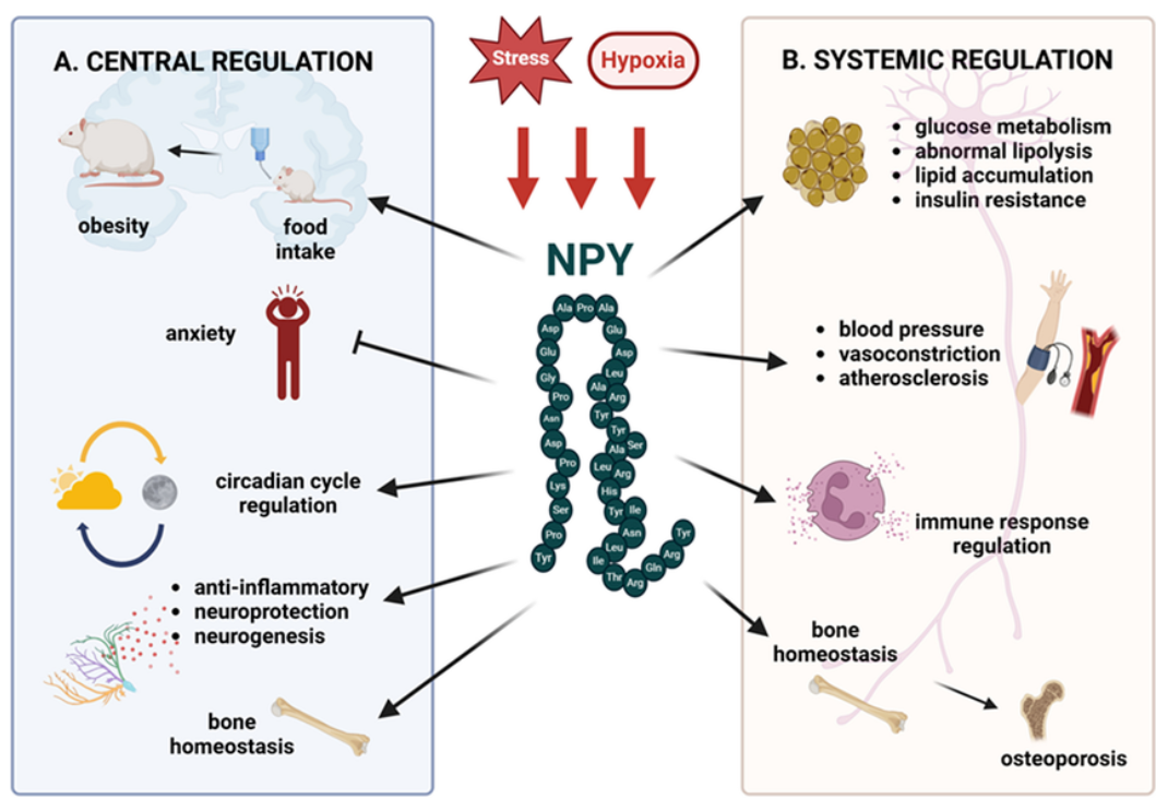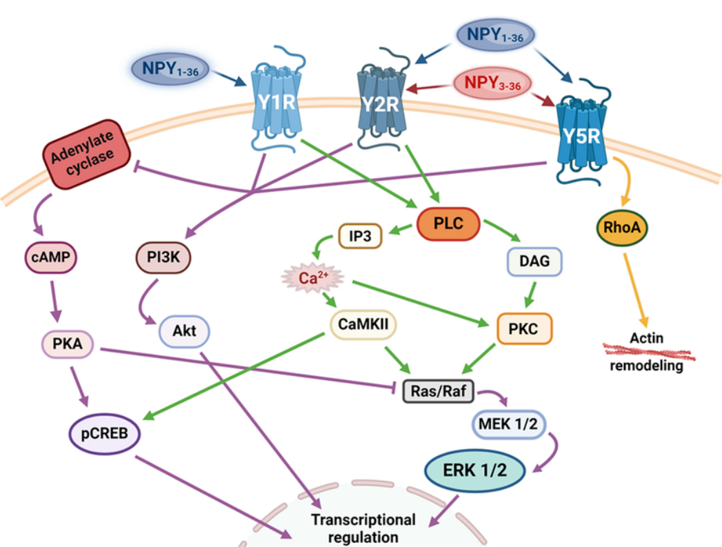 在人類中,NPY主要通過三種GPCR- Y1R、Y2R和Y5R起作用。Y1R需要全長NPY1-36才能激活,而Y2R和Y5R也可以結(jié)合NPY3-36。所有NPY受體通過Gi/o蛋白發(fā)出信號,并通過腺苷酸環(huán)化酶抑制cAMP合成,從而阻斷PKA對下游通路的抑制作用。NPY信號傳導(dǎo)的第二種機(jī)制是針對Y1R和Y2R的,涉及Ca 2 +的動員以及隨后PKC和CaMKII的鈣依賴性激活。同時,這些信號通路導(dǎo)致ERK1/2的激活。此外,所有NPY受體都能夠激活PI3K/Akt通路。Y5R的具體特征是能夠激活RhoA,從而調(diào)節(jié)細(xì)胞骨架重塑。