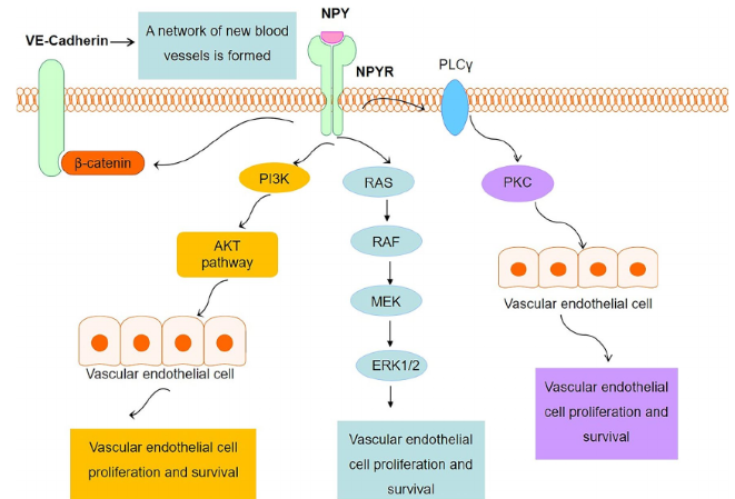 以血管內(nèi)皮細(xì)胞為例,NPY與其受體結(jié)合后,通過PI3K/AKT通路、RAS/RAF/MEK/ERK1/2通路、PKC通路促進(jìn)內(nèi)皮細(xì)胞增殖,為血管提供營養(yǎng),調(diào)節(jié)微環(huán)境。