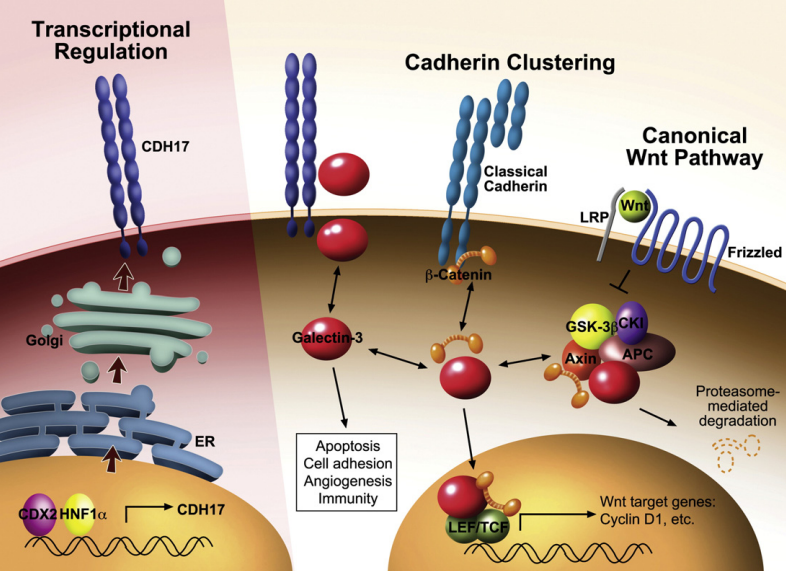 雖然CDH17在癌癥中作用的確切機制仍然難以捉摸,但幾項研究已經(jīng)揭示了它的潛在功能。在肝細胞癌(HCC)中,CDH17能與E-cadherin結(jié)合調(diào)控細胞的黏附,以及CDH17胞內(nèi)銜接蛋白Galectin-3通過在細胞核中與β-catenin結(jié)合參與典型Wnt信號傳導,這表明CDH17參與Wnt信號的激活。