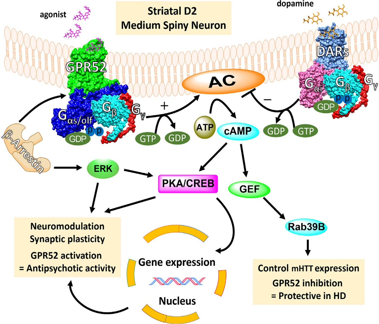 GPR52 是一種高度進(jìn)化保守、腦部富集的G 蛋白偶聯(lián)受體 (GPCR),其與非孤兒型GPCR的序列同源性低于20%。由于其內(nèi)源性配體未知且與非孤兒型GPCR的結(jié)構(gòu)相似度低,GPR52的生理功能尚未得到充分闡明。然而,GPR52在cAMP依賴性細(xì)胞反應(yīng)中的功能作用已逐漸明晰,有文獻(xiàn)揭露了GPR52的cAMP依賴性信號(hào)通路以及在伏隔核中等棘神經(jīng)元(MSNs)中與其他功能蛋白的相互作用。GPR52與Gs或Golf偶聯(lián),促進(jìn)腺苷酸環(huán)化酶(AC)活性,提高cAMP水平,進(jìn)而誘導(dǎo)蛋白激酶A(PKA)激活和cAMP反應(yīng)元件結(jié)合蛋白(CREB)的表達(dá),從而調(diào)節(jié)細(xì)胞反應(yīng)和基因表達(dá)。(此外,GPR52還能招募并相互作用于β-arrestins,這可能會(huì)導(dǎo)致細(xì)胞外信號(hào)調(diào)節(jié)激酶(ERK)磷酸化信號(hào)的激活。相比之下,被激活的多巴胺受體(DARs),如 D2/D3 受體(D2R/D3R),與 Gi/o 蛋白偶聯(lián),抑制腺苷酸環(huán)化酶(AC)的活性,從而導(dǎo)致環(huán)磷酸腺苷(cAMP)的生成減少。GPR52 和 D2R 分別在激活和減少 cAMP 信號(hào)傳導(dǎo)方面的作用相反,這支持了 GPR52 激動(dòng)劑能夠阻止 D2R 信號(hào)傳導(dǎo)的概念,從而在神經(jīng)精神疾病中產(chǎn)生類似抗精神病藥物的效果。