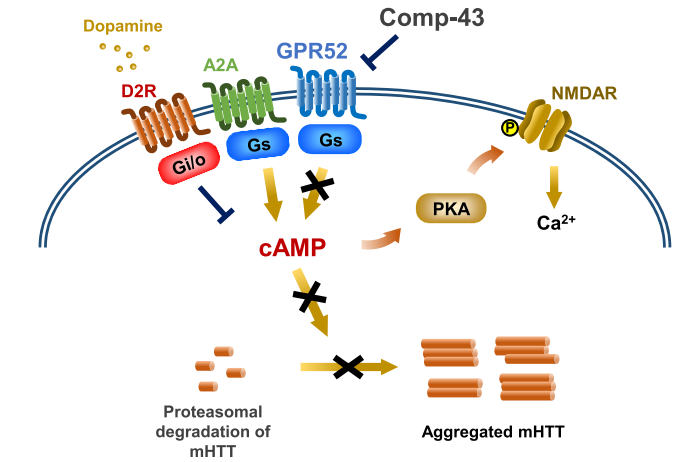 還有文獻(xiàn)報(bào)道關(guān)于用于治療亨廷頓病的 GPR52 信號(hào)傳導(dǎo)模型。在紋狀體中,GPR52 在表達(dá)多巴胺 D2 和腺苷 A2a 受體的紋狀體蒼白球神經(jīng)元中表達(dá)。GPR52 拮抗劑 Comp-43 會(huì)導(dǎo)致突變亨廷頓蛋白(mHTT)的蛋白酶體降解。相反,通過(guò)增加細(xì)胞內(nèi) cAMP 激活 GPR52 會(huì)將 mHTT 運(yùn)輸?shù)絻?nèi)質(zhì)網(wǎng)并防止其降解。GPR52 調(diào)節(jié)多巴胺能和谷氨酸能傳遞,并通過(guò) NMDA 受體控制運(yùn)動(dòng)行為以及精神癥狀。
