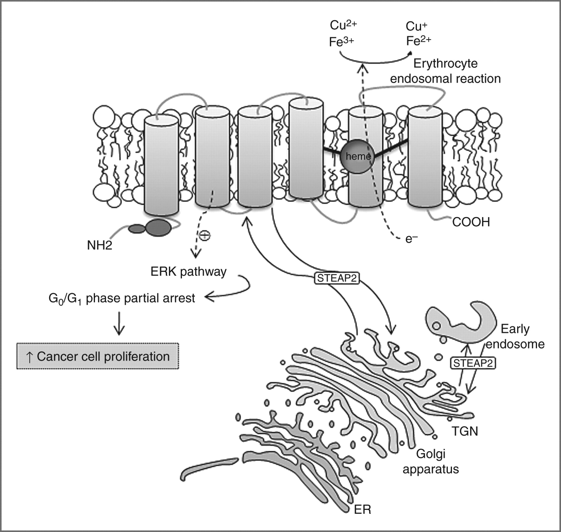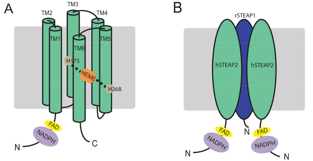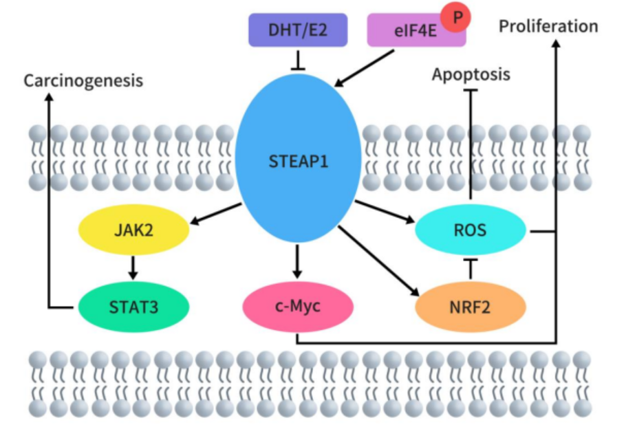 STEAP2,又被稱為前列腺六跨膜蛋白 1(STAMP1),是一種由 490 個(gè)氨基酸組成的(56.1 kDa)蛋白質(zhì),其在高爾基體復(fù)合體、跨高爾基體網(wǎng)絡(luò)以及質(zhì)膜中高度表達(dá)。這表明 STEAP2 參與了某些內(nèi)吞和外排運(yùn)輸途徑。STEAP2 有助于紅細(xì)胞中 Fe3+ 和 Cu2+ 的正常攝取,并將其還原為 Fe2+ 和 Cu+,從而促進(jìn)轉(zhuǎn)鐵蛋白循環(huán)的進(jìn)行。通過(guò)激活 ERK 通路,STEAP2 誘導(dǎo)癌細(xì)胞在 G0-G1 細(xì)胞周期階段的部分停滯,從而增加細(xì)胞增殖和腫瘤發(fā)展。