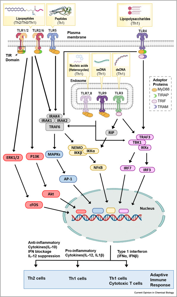 TLR信號通路在免疫調(diào)節(jié)中發(fā)揮重要作用。髓樣分化因子88(myeloid differentiation factor 88,My D88)是TLR信號通路中重要的銜接蛋白。TIR結(jié)構(gòu)域在配體誘導(dǎo)二聚化后可以通過募集銜接蛋白傳遞細(xì)胞內(nèi)信號,MyD88是除 TLR3外所有TLR的通用銜接蛋白,通過激活白細(xì)胞介素 1 受體相關(guān)激酶 (IRAK)/TNF 受體相關(guān)因子 (TRAF) 6 復(fù)合物可以激活 AP-1 和 NFKB 通路導(dǎo)致促炎細(xì)胞因子。TLR3(和TLR4)通過含有TIR結(jié)構(gòu)域的接頭誘導(dǎo)干擾素-β(TRIF),TLR7和TLR9通過MyD88蛋白,通過TRAF3激活干擾素調(diào)節(jié)因子(IRF)3和7,導(dǎo)致1型干擾素反應(yīng)。TLR2 通過磷酸肌醇 3-激酶 (PI3K) 和細(xì)胞外信號調(diào)節(jié)激酶 (ERK) 1/2 通路可誘導(dǎo)抗炎細(xì)胞因子 (IL-10) 并抑制 IL-12 和 IFN。其他 TLR 接頭包括 MyD88 接頭樣 (MAL),也稱為 TIR 結(jié)構(gòu)域含接頭蛋白 (TIRAP),用于 TLR2 和 TLR4 MyD88 依賴性信號傳導(dǎo)和用于 TRIF 信號傳導(dǎo)的 TRIF 相關(guān)接頭分子 (TRAM)。