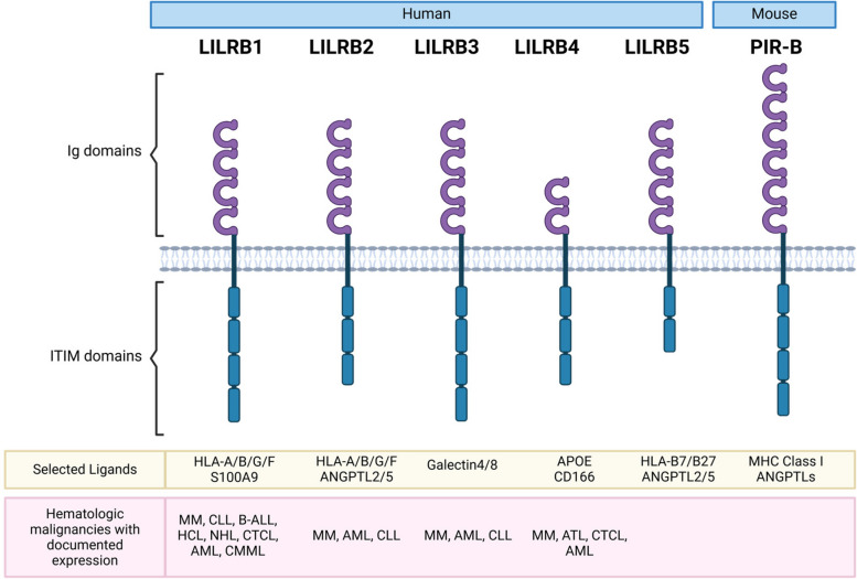 白細(xì)胞免疫球蛋白樣受體亞家族B(LILRB)因在腫瘤微環(huán)境中起到免疫抑制作用,逐漸受到越來(lái)越多的關(guān)注。其家族包含5個(gè)成員:LILRB1(LIR-1, ILT2, CD85j)、LILRB2(LIR-2, ILT4, CD85d)、LILRB3(LIR-3, ILT5, CD85a)、LILRB4(LIR-5, ILT3, CD85k)、LILRB5(LIR-8, CD85c)。LILRB家族結(jié)構(gòu)及配體如下圖所示: