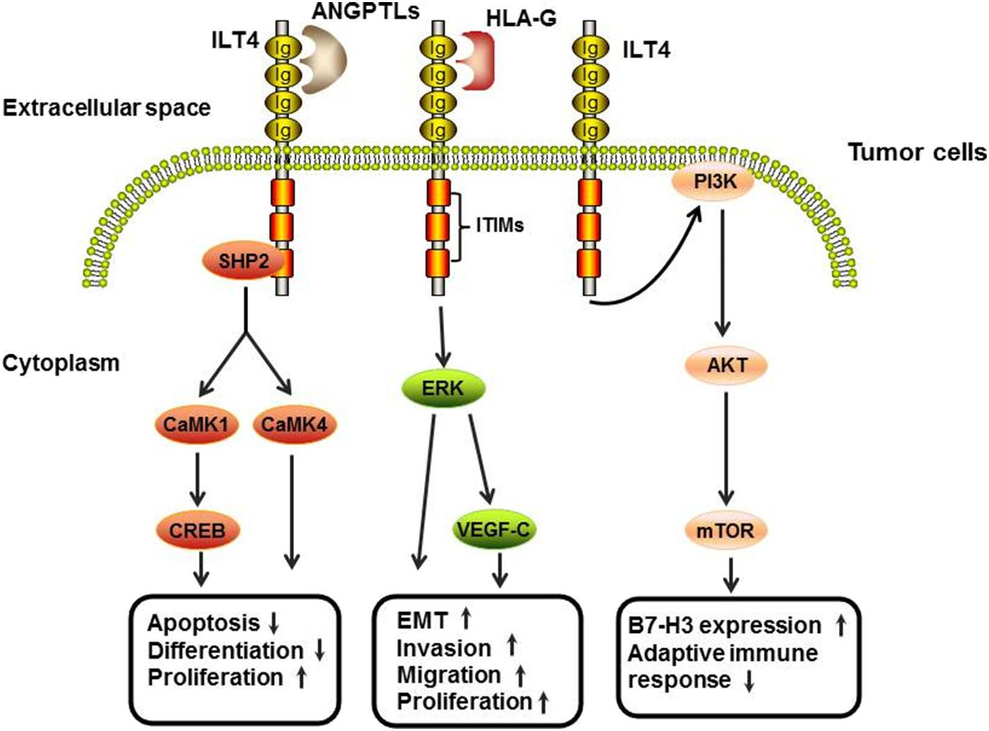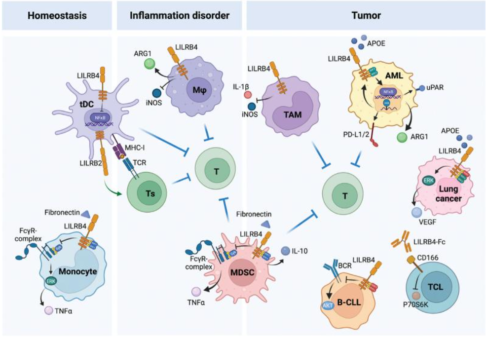 LILRB4可通過(guò)NF-kB信號(hào)傳導(dǎo)導(dǎo)致細(xì)胞凋亡,并通過(guò)降低磷酸酶(SHP)1磷酸化激活NF-kB信號(hào)傳導(dǎo)導(dǎo)致炎癥。LILRB4在多種腫瘤細(xì)胞中表達(dá),包括實(shí)體瘤和血液腫瘤。LILRB4還是單核細(xì)胞白血病的重要標(biāo)志物,通過(guò)ApoE/LILRB4/SHP-2信號(hào)軸在急性髓系白血?。ˋML)細(xì)胞中支持腫瘤細(xì)胞浸潤(rùn)到組織中并抑制T細(xì)胞活性。因此,LILRB4是治療單核細(xì)胞急性髓細(xì)胞白血病的重要靶點(diǎn)。在肺癌細(xì)胞中,LILRB4被APOE結(jié)合激活,并募集SHP-2和SHIP-1激活ERK1/2信號(hào)傳導(dǎo)并增加血管內(nèi)皮生長(zhǎng)因子(VEGF)的表達(dá)以促進(jìn)癌癥轉(zhuǎn)移。