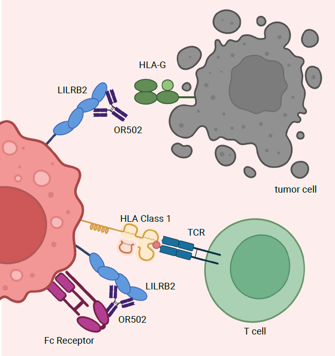LILRB2主要表達(dá)于髓系細(xì)胞(如單核細(xì)胞、巨噬細(xì)胞、樹(shù)突狀細(xì)胞)和某些腫瘤細(xì)胞。它通過(guò)與配體(如HLA-G、ANGPTLs、SEMA4A和CD1d)結(jié)合,傳遞抑制性信號(hào),抑制免疫細(xì)胞的活性,促進(jìn)腫瘤免疫逃逸。