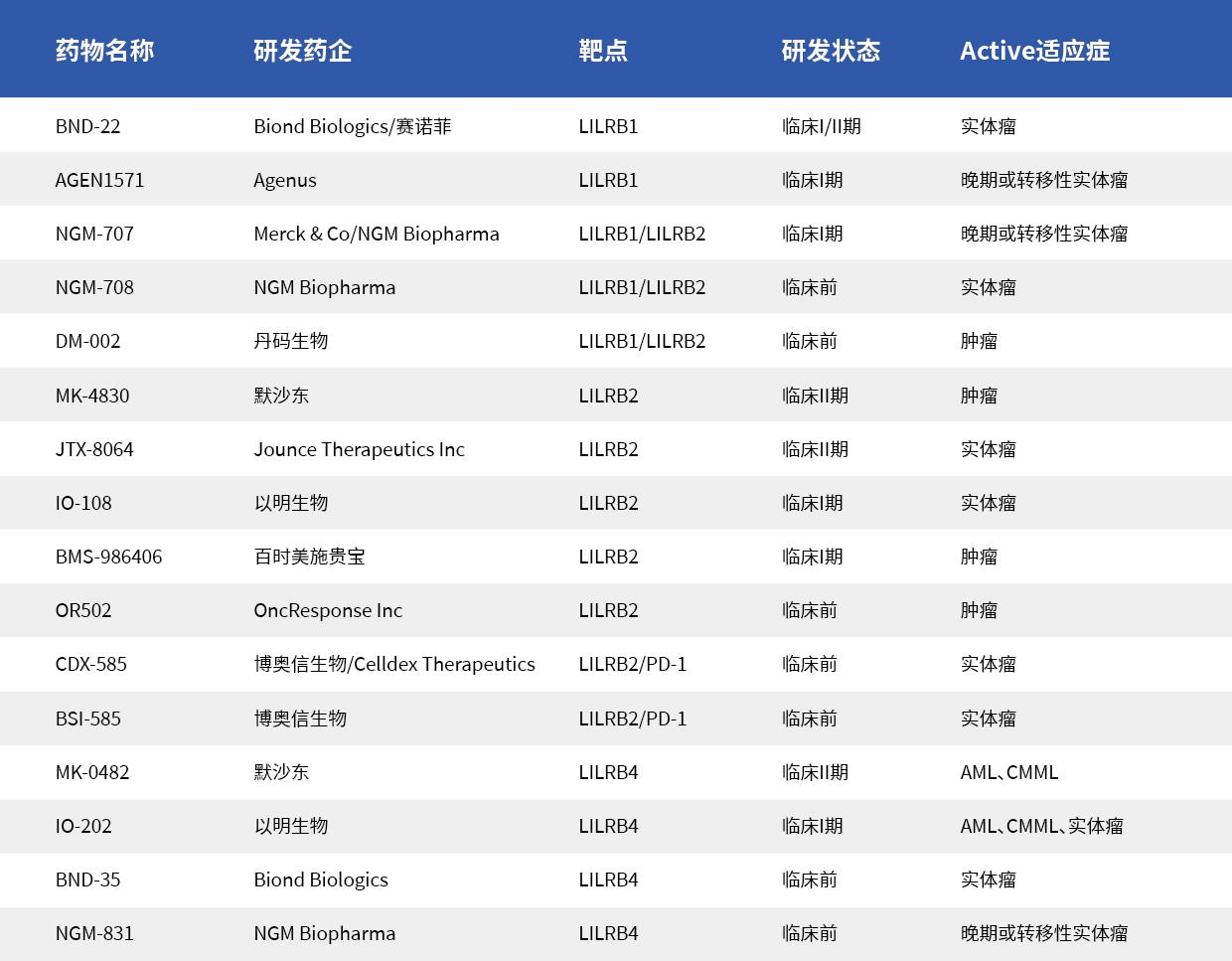 作為免疫檢查點(diǎn)的一員,同時(shí)又是腫瘤維持因子,LILRB被認(rèn)為是腫瘤治療具有潛力的靶點(diǎn),目前部分藥企研發(fā)進(jìn)展如下: